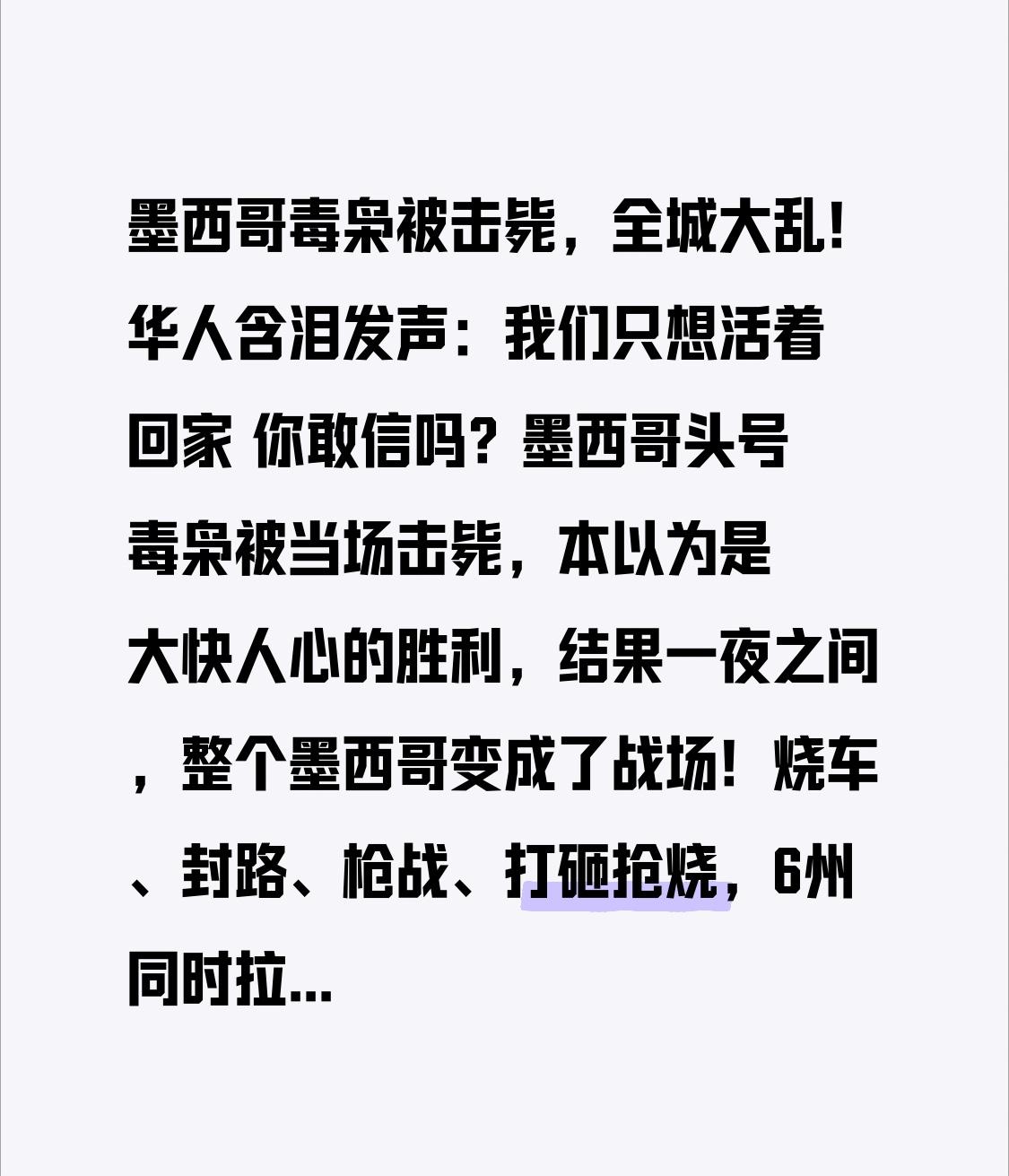 墨西哥毒枭被击毙,全城大乱!华人含泪发声:我们只想活着回家 你敢信吗?墨西哥头号毒枭被当场击毙,本以为是大快人心的胜利,结果一夜之间,整个墨西哥变成了战场!烧车、封路、枪战、打砸抢烧,6州同时拉响红色警报,学校停课、航班取消、店铺全关,而最让人心疼的,是被困在当地的华人同胞。 当地时间2月22日,墨西哥军方成功击毙全球悬赏最高的大毒枭“门乔”,美国悬赏1500万美元追捕的恶魔,终于落网。消息一出,很多人拍手叫好,可谁也没想到,这只是噩梦的开始。 毒贩集团疯狂报复,街头火光冲天,汽车被点燃堆成路障,枪声不断,无辜路人吓得四处逃窜。当地居民不敢出门、不敢开窗,外面每一声响动,都让人头皮发麻。 而在混乱中心的华人,彻底慌了。多位华人同胞发声:“街上全是被烧的车,我们不敢出门,商店全部关门,只能躲在家里等消息。”“本来是打工、旅游、做生意,现在只想活着离开。” 中国驻墨西哥大使馆第一时间紧急提醒:所有中国公民立刻居家避险,不要外出,远离冲突区域,遇到危险立刻联系使馆! 很多人以为,毒枭、枪战、暴乱只在电影里,可对海外华人来说,这就是眼前的现实。他们背井离乡,辛苦打拼,不是为了经历战火,不是为了提心吊胆,只是想过安稳日子。 最让人破防的是,有华人游客说:“我只是来旅游,现在只想回国,这里太可怕了。” 我们总说岁月静好,可你不知道,平安从来都不是天上掉下来的。在国内,我们可以深夜撸串、放心逛街,可在世界上很多地方,连出门都需要勇气。 毒枭伏法是正义,但混乱还在继续。真心祝愿所有在墨西哥的华人同胞平平安安,早日远离危险,顺利回到祖国怀抱。 也想告诉所有人:出国在外,安全永远是第一位。无论你在哪里,祖国永远是我们最硬的底气,最暖的依靠!