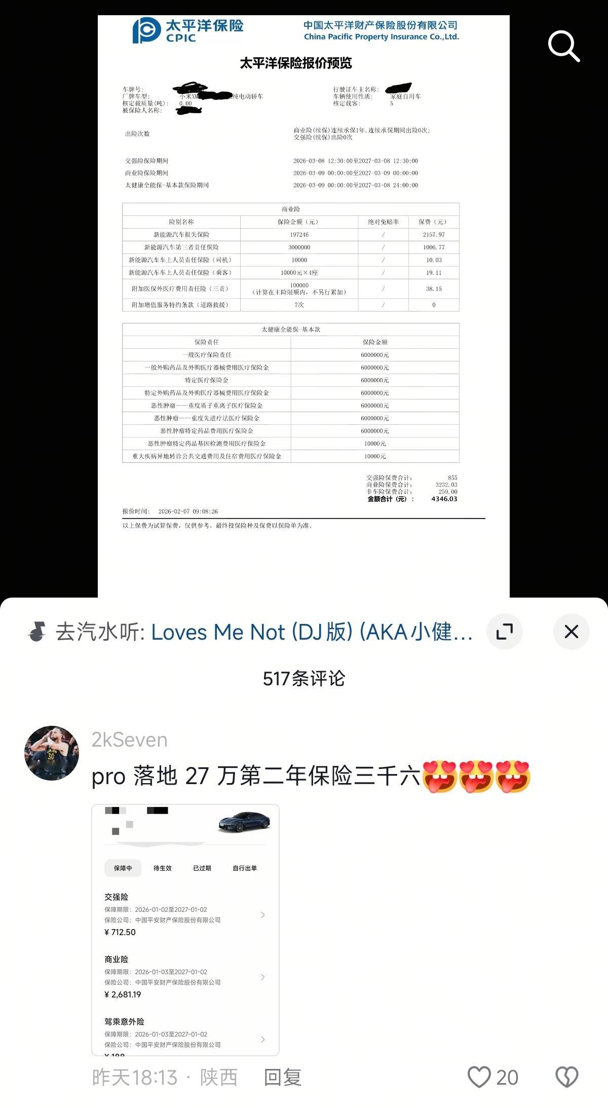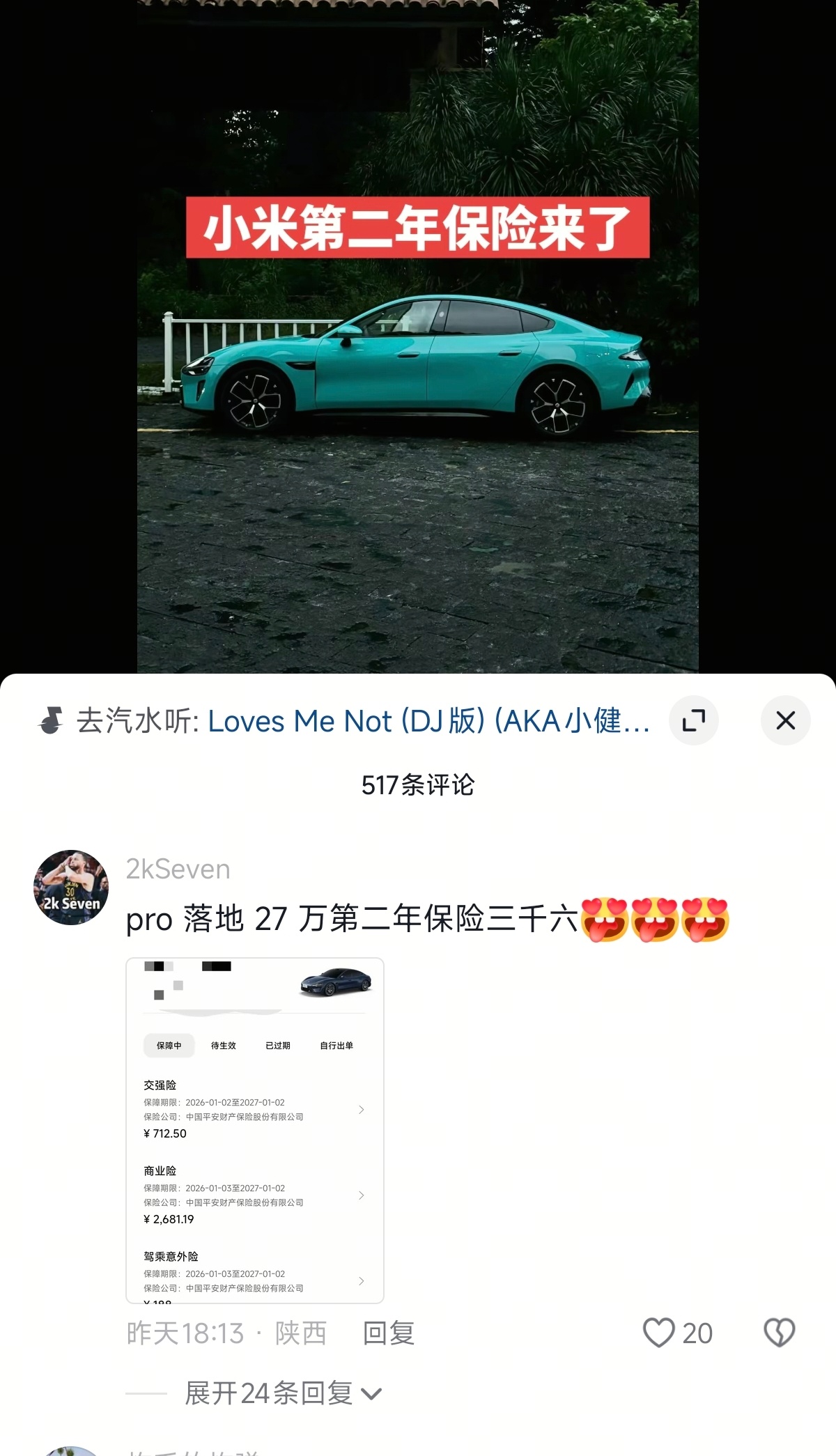 小米SU7第二年车险来了,300万,4300+。评论区:Pro版本,第二年360