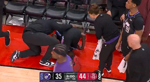 文斯-威廉姆斯回防时拉伤大腿,随后被工作人员抬回更衣室