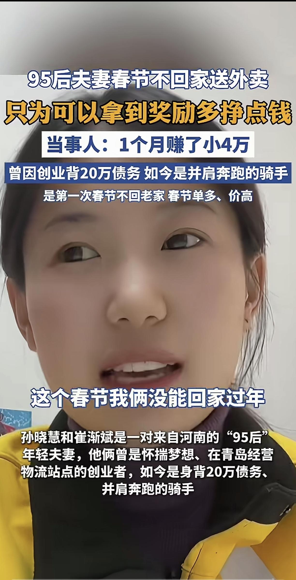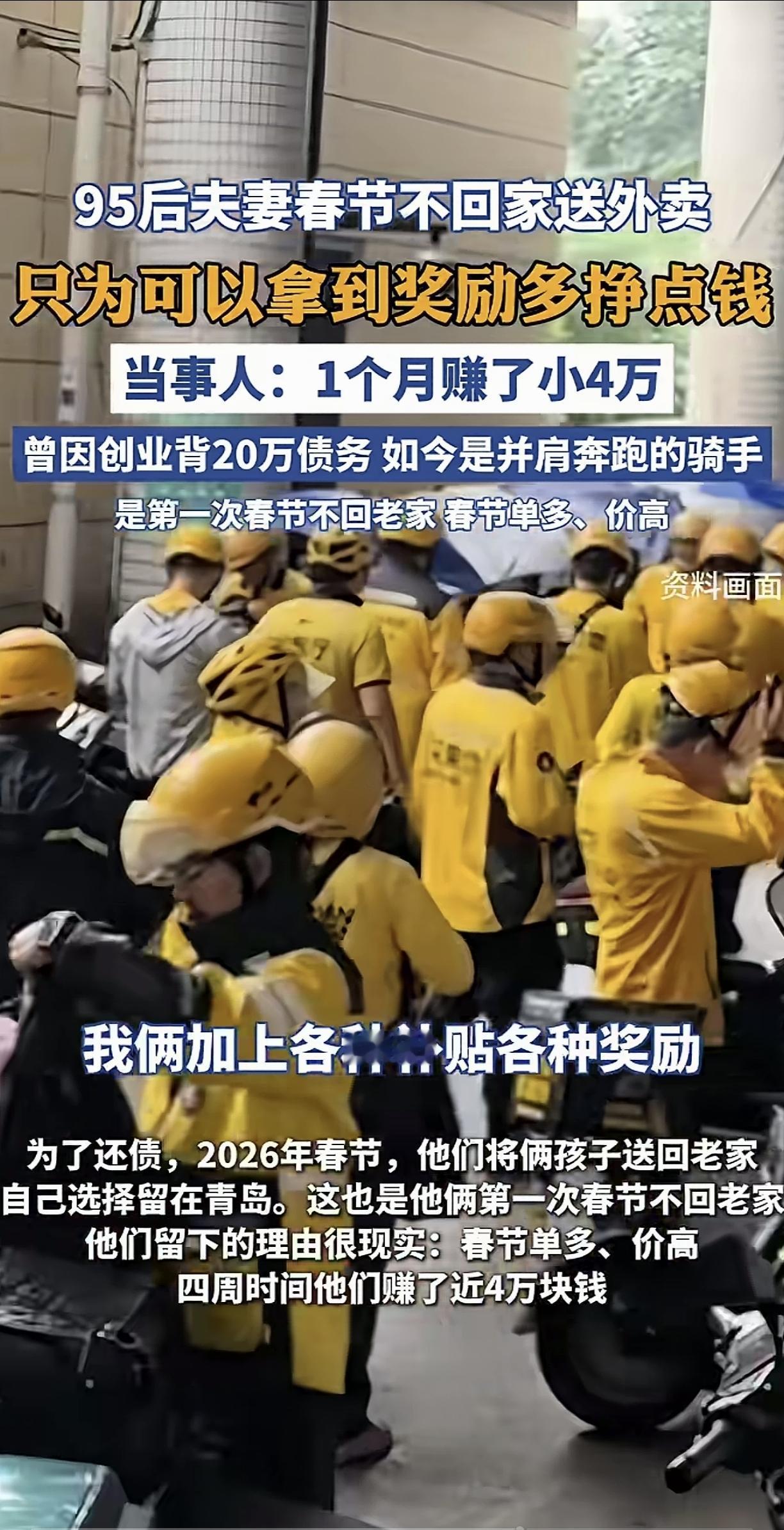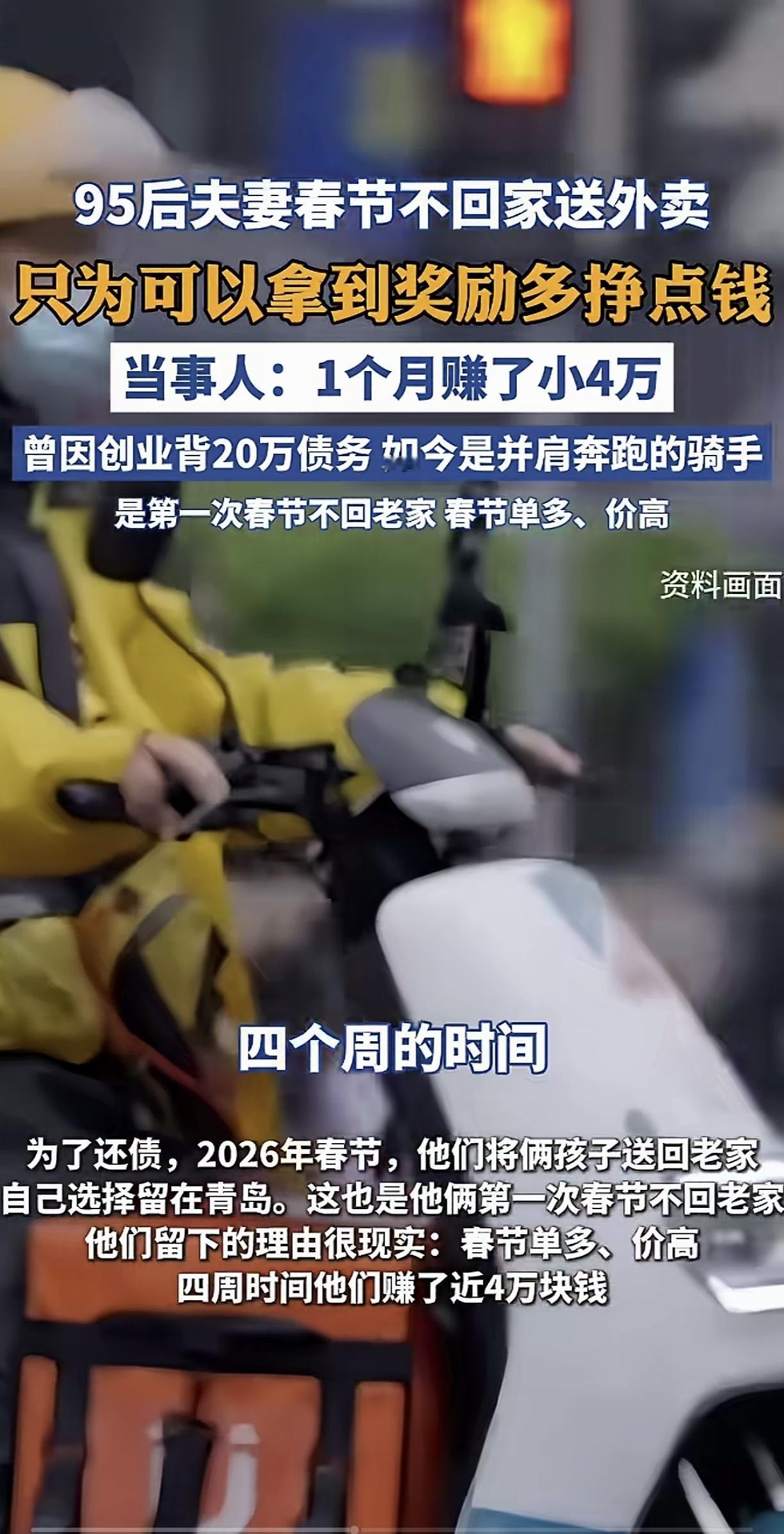 真的破防了! 青岛这对95后小夫妻,春节不仅不回老家陪孩子,反而留在寒风中送外卖,当得知他们一个月狂赚了4万元后,背后的真相让我心里又酸又佩服 别人过年都是阖家团圆,走亲访友,这对夫妻俩却穿着外卖服,骑着电动车在冷风里跑单,整个春节一天都没歇 不是不想回河南老家陪孩子,是之前创业失败,背上了20万的外债,只能趁着春节的补贴和溢价,多跑一单是一单,早点把债还清 有媒体报道说,夫妻俩这个月跑了快4万块钱,结果这话一出,评论区直接吵翻了。不少跑外卖的同行出来质疑,说春节商家大多歇业,单量根本没那么多,两个人一个月跑4万根本不现实,话说得也很难听 我特意算了笔账,月入4万,平均下来夫妻俩每天要赚1300多,一人一天要赚650块左右。春节期间外卖单的基础运费本来就高,加上平台的新春冲单奖励、雨雪溢价,一单平均能拿到15-20块,算下来一个人一天要跑30-40单 不是说这个数字轻轻松松就能做到,恰恰相反,这意味着他们每天要从早跑到晚,一天跑12个小时以上,吃饭只能随便啃两口干粮,遇上刮风下雨也不能停,连喝口热水的功夫都没有,完全是拿身体和时间硬扛,换普通人根本熬不下来 最戳我的,是妻子说的一句话,她说“两个人一起跑,一起扛,债总能一笔一笔还清,苦日子也总会到头的” 我们总说成年人的世界没有容易二字,可真正能在跌入谷底的时候,放下身段、咬着牙断臂求生的人,真的太少了。他们没有躺平,没有抱怨,两个人并肩扛着生活的重压,哪怕在万家团圆的日子里,也在为了家人、为了以后的日子拼命往前跑,这份韧劲,真的太让人敬佩了 当然我也知道,这个收入确实是极端个例,不是所有外卖员春节都能拿到这个数,背后是常人扛不住的辛苦和付出 对此您是怎么看的呢?