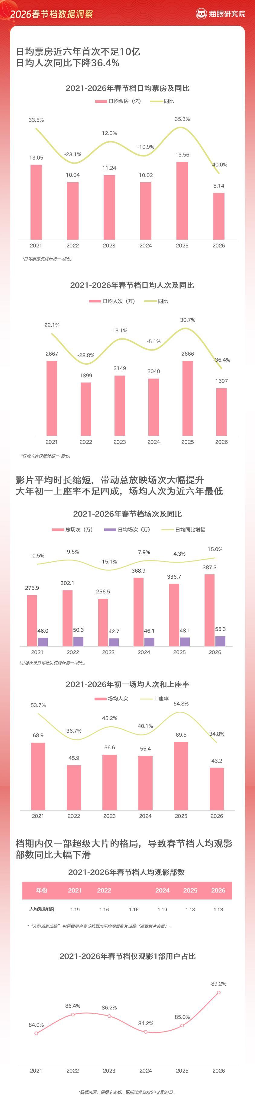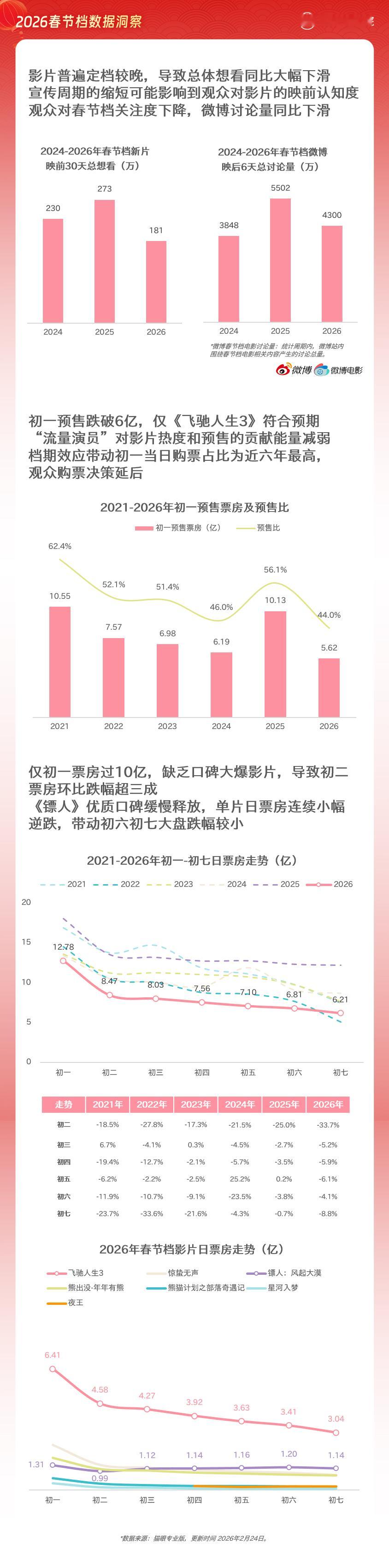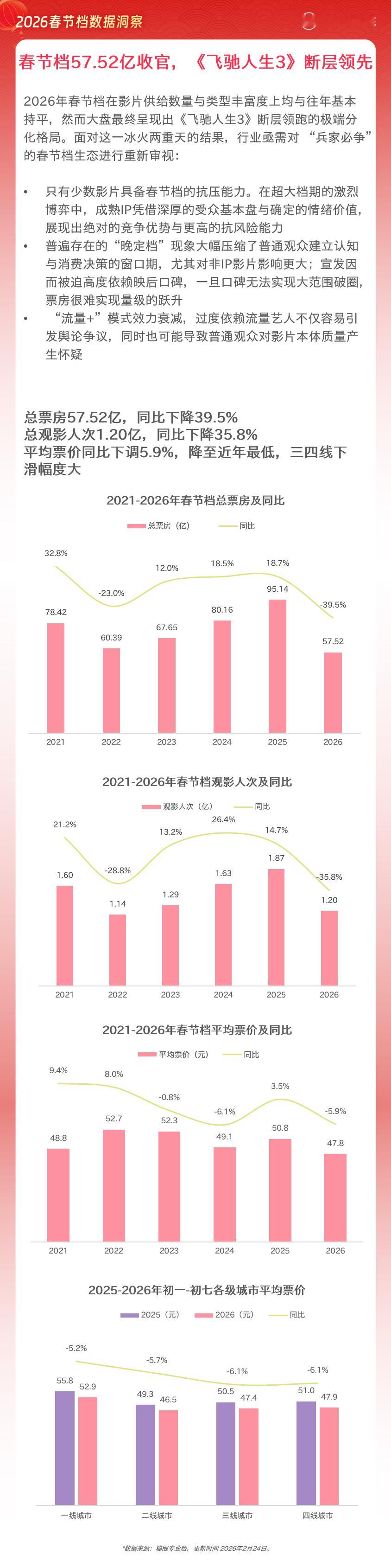 猫眼研究院发布2026春节档数据洞察 数据显示,2026年春节档总票房57.52