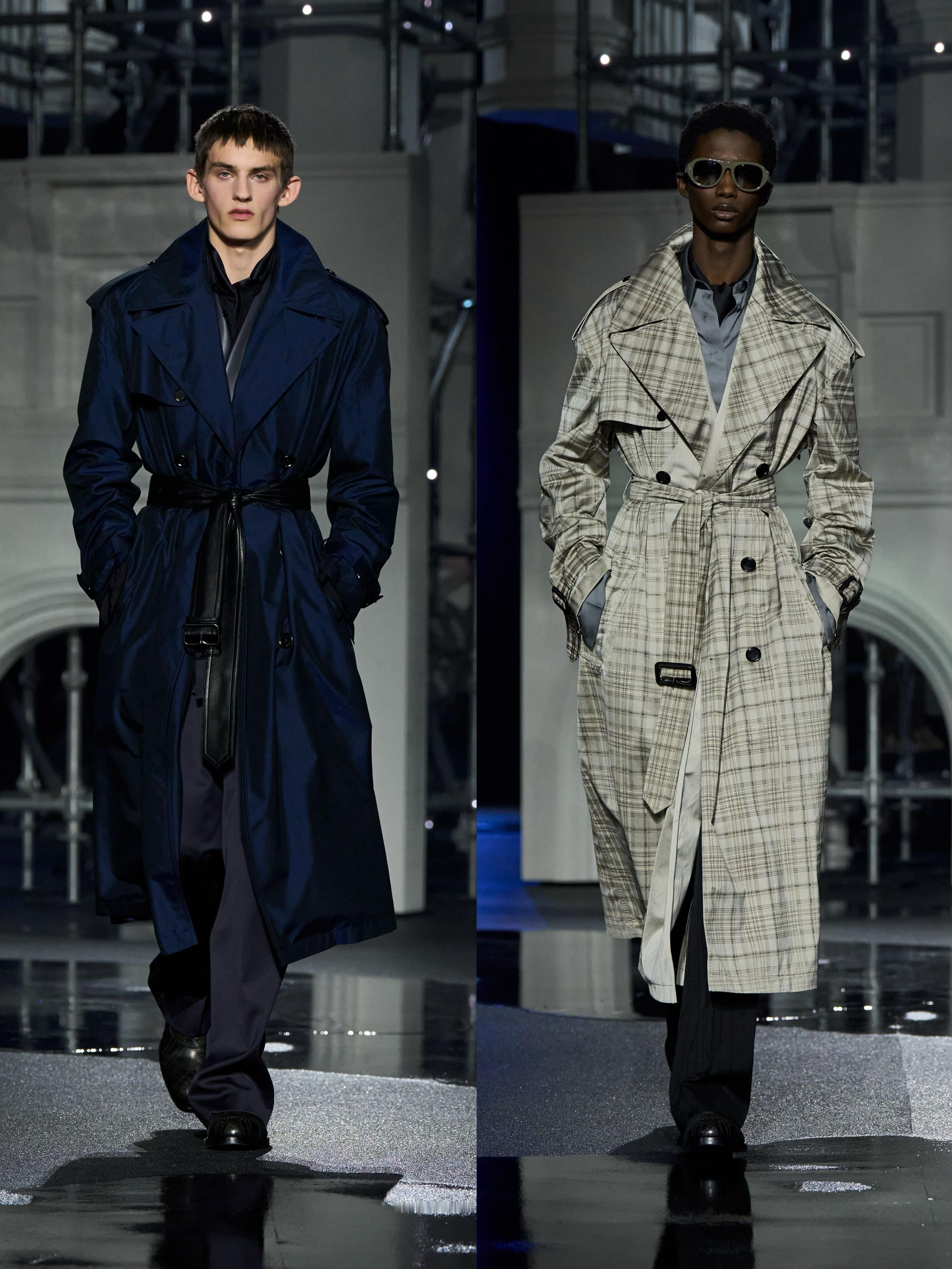 整个系列,是Daniel Lee 军风服饰以女性化风格的全新诠释。风衣被添加了夸张的荷叶边领;人造皮草的下摆处缀以闪亮的流苏,宛如雨滴划过;不同的风衣被皮带和肩章点缀;风衣款型不仅有圈圈呢和皮革款,还有格纹编织款,配搭了毛领。其中有一件面料织着一幅复古的伦敦地图,地图上的图案展现了泰晤士河蜿蜒流经伦敦城的街道,这幅图案也出现在时装秀的邀请函、宾客收到的丝巾以及Daniel Lee 当天所穿的T恤上。