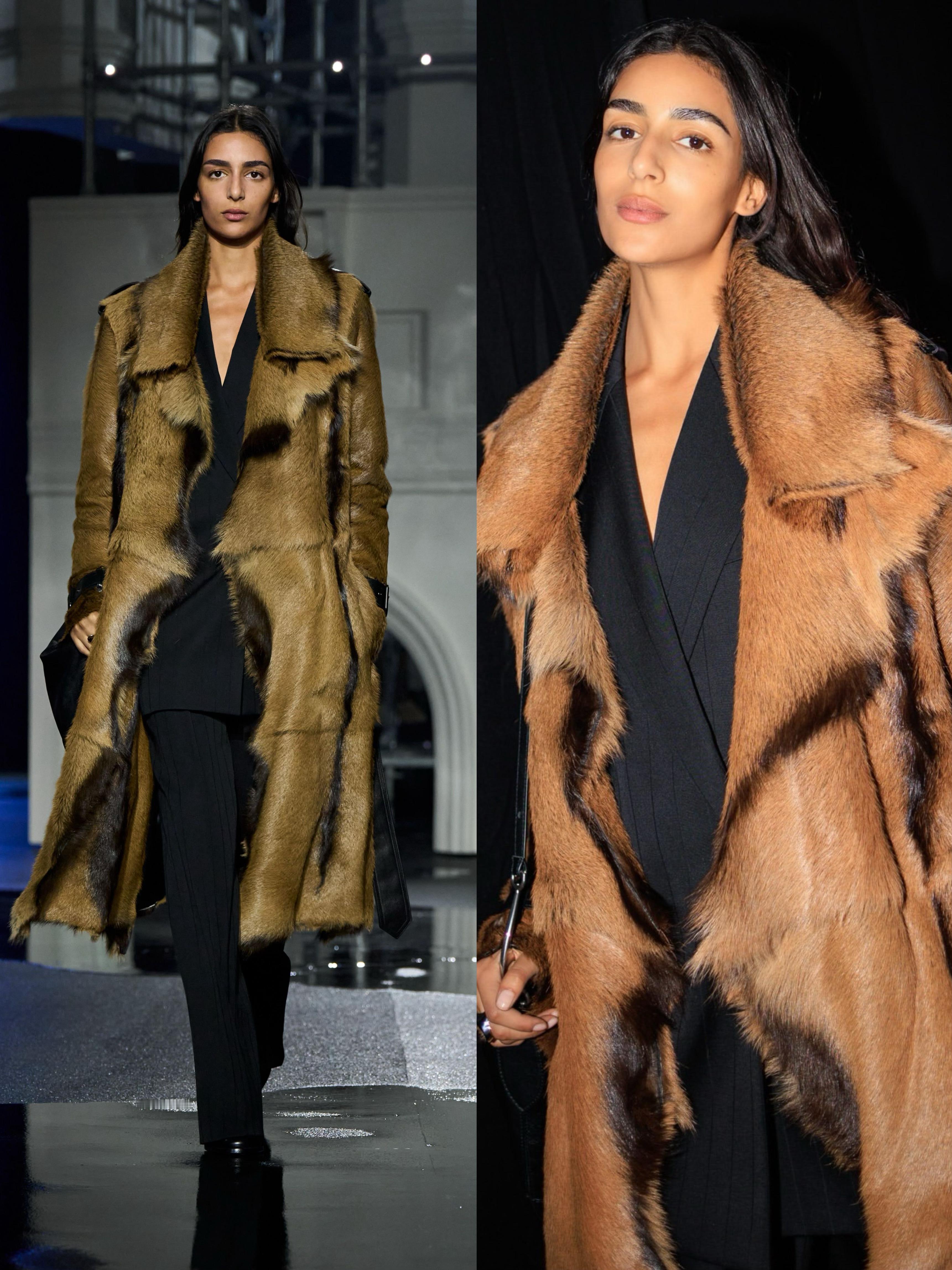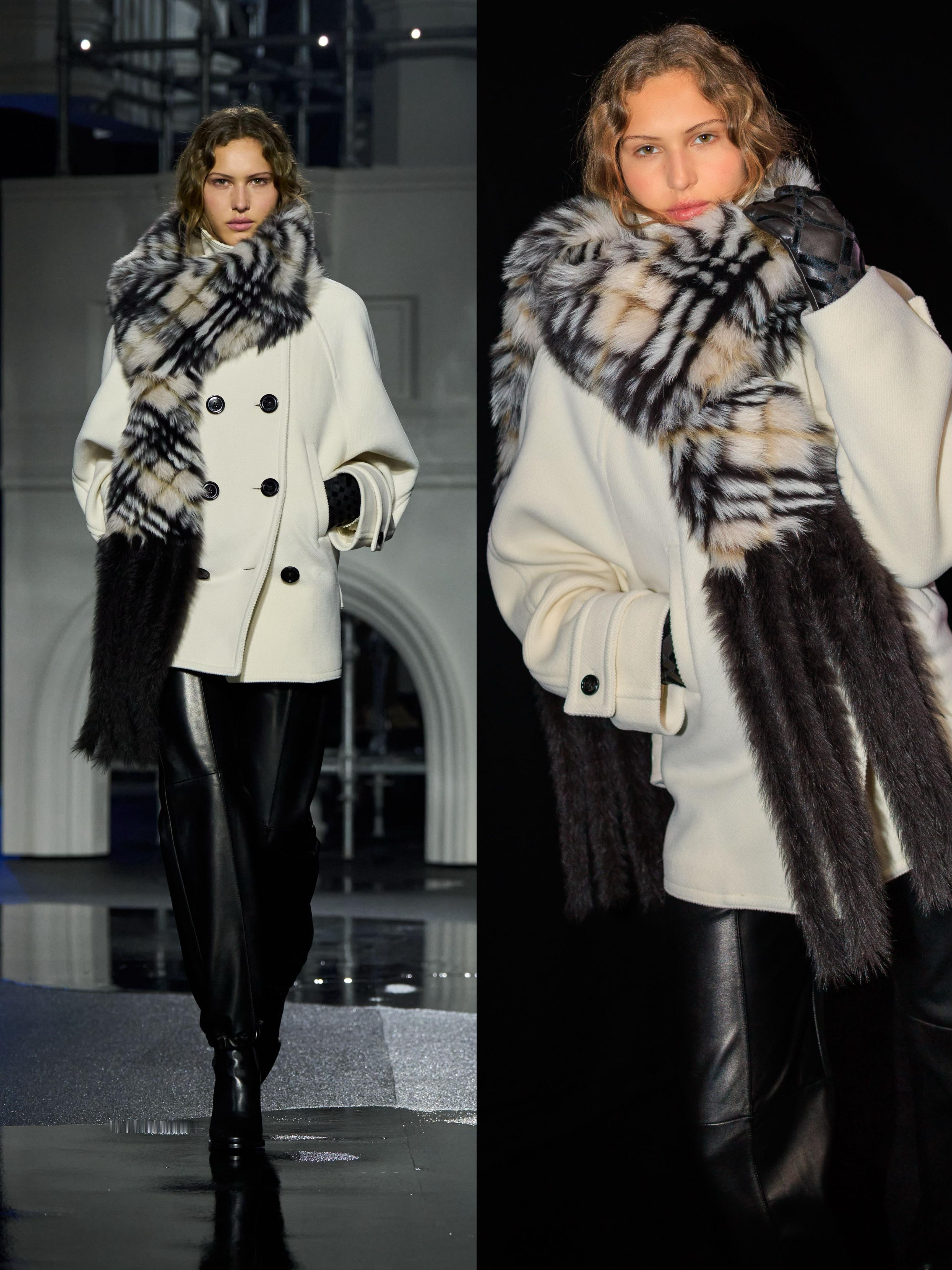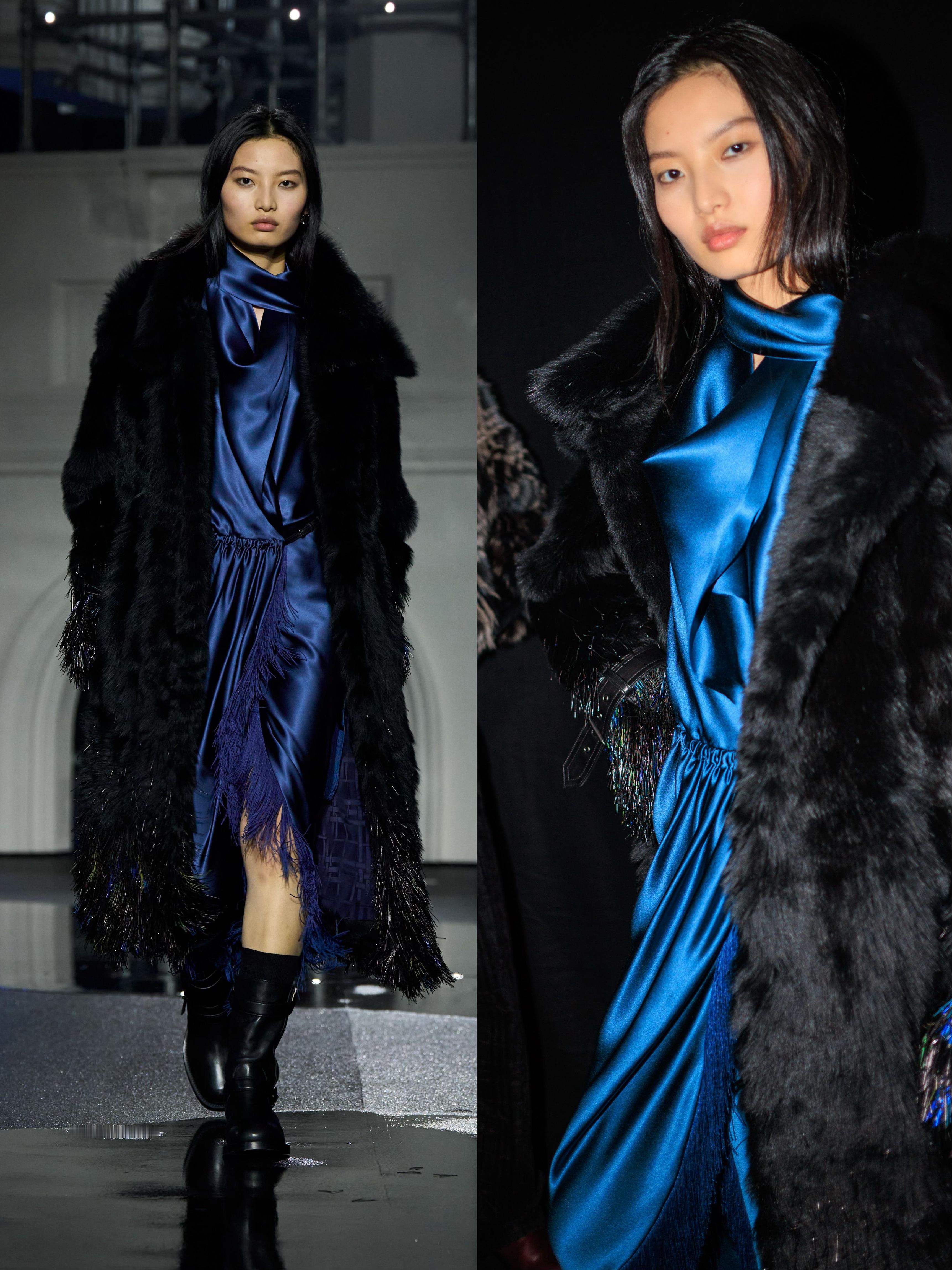 除了风衣,这一季还有一些质地柔软的皮革制品、苏格兰短裙、搭配修身运动裤的飞行员夹克,以及一系列剪裁利落的布质外套。而一些经典之作也被创意重塑,外套、晚宴西装和丝质衬衫呈现更加年轻化的穿着方式。模特们外穿风衣内穿光滑的缎面裙装,随性休闲,又不失伦敦人毫不费力的优雅。面料选择上除了皮革、人造皮草、羊毛、羊羔皮、格纹面料还有罗缎材质做装饰。