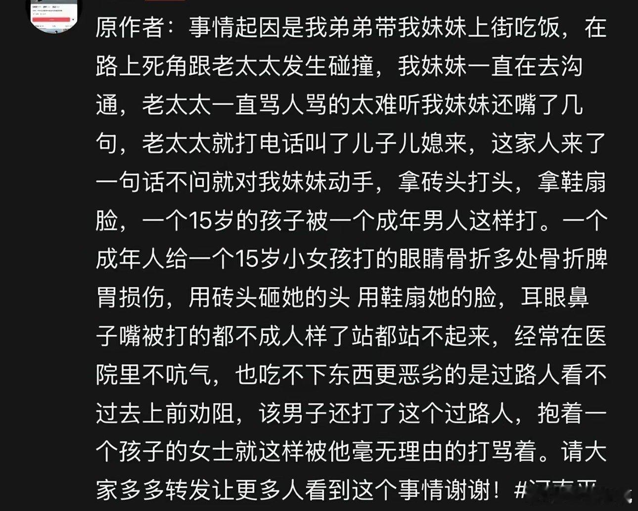平顶山被打女孩轻伤二级2月19日晚,15岁女孩丁某和弟弟因电动车剐蹭与一老人发生口角。老人叫来儿子刘某飞、儿媳韩某娜,两人当街暴力殴打女孩,致其受伤昏迷。2月21日,官方通报:刘某飞、韩某娜被刑拘。2月24日最新:女孩已苏醒,眉骨骨裂、轻伤二级,心理受创;家属只求严惩凶手、讨回公道。