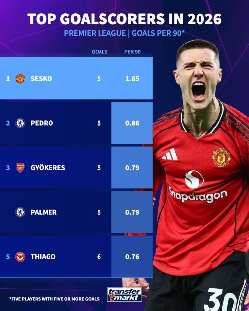 直播吧2月24日讯英超第27轮比赛,曼联在客场以1-0的比分小胜埃弗顿,舍什科打进全场唯一进球。进入2026年,斯洛文尼亚前锋已在英超中打进5球。