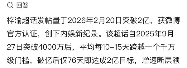 恭喜梓渝超话发帖量突破两个亿!距离上次超话发帖量破亿仅过81天!2026年开年仅