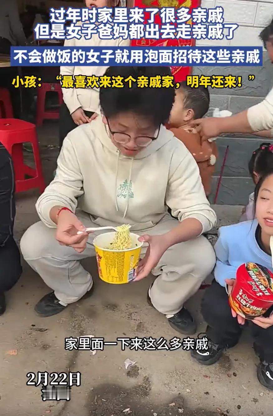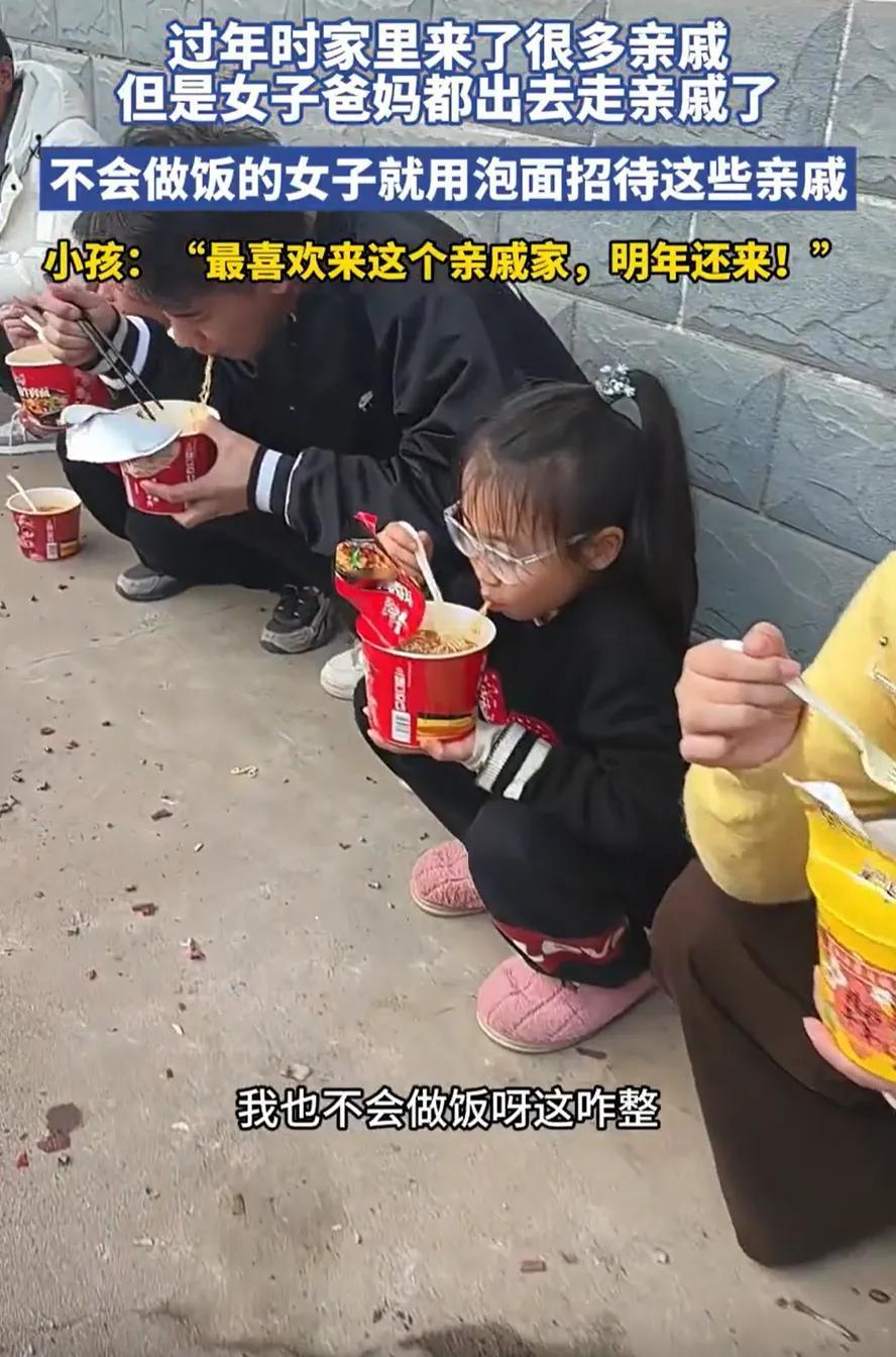 十几位亲戚突然登门,姑娘不会做饭,只端出一样东西,场面反倒格外热闹。 江西农村,一对父母外出走亲戚,只留女儿一人在家歇息。 本是清闲自在的半日,院门却突然被推开,一下子涌进十多位亲友。 姑娘当场愣住,寒暄尚可,可眼看临近正午,吃饭成了最大难题。 她自幼极少下厨,别说置办一桌酒菜,连寻常饭菜都难以做好。 村中无饭店,外出购买也来不及,一屋子人总不能空着肚子离去。 情急之下,她翻出家中囤放的泡面,悉数摆开任人挑选。 屋内坐不下,有人便端着碗蹲在院门口,热汤热气,倒也自在。 孩子们最为欢喜,平日家中管束严格,此刻能吃上泡面,个个喜笑颜开。 满院人吃得津津有味,姑娘站在一旁,哭笑不得。 有网友感慨,过年大鱼大肉早已吃腻,一碗泡面反而更合心意。 也有人不解,走亲戚理应提前告知,这般不请自来,着实唐突。 可乡下人情,本就如此随性。 过年串门,常常是说走就走,一路相聚,人便越聚越多。 有人觉得泡面待客不够体面,可细细想来,真诚远比排场重要。 与其勉强做出一桌难以下咽的饭菜,不如坦然相待,舒心自在。 真正的自家人,从不会计较一顿饭的贵贱。 热闹相聚,心意到了,便胜过一切山珍海味。 这顿简单的泡面,反倒成了过年里,最特别也最难忘的一餐。