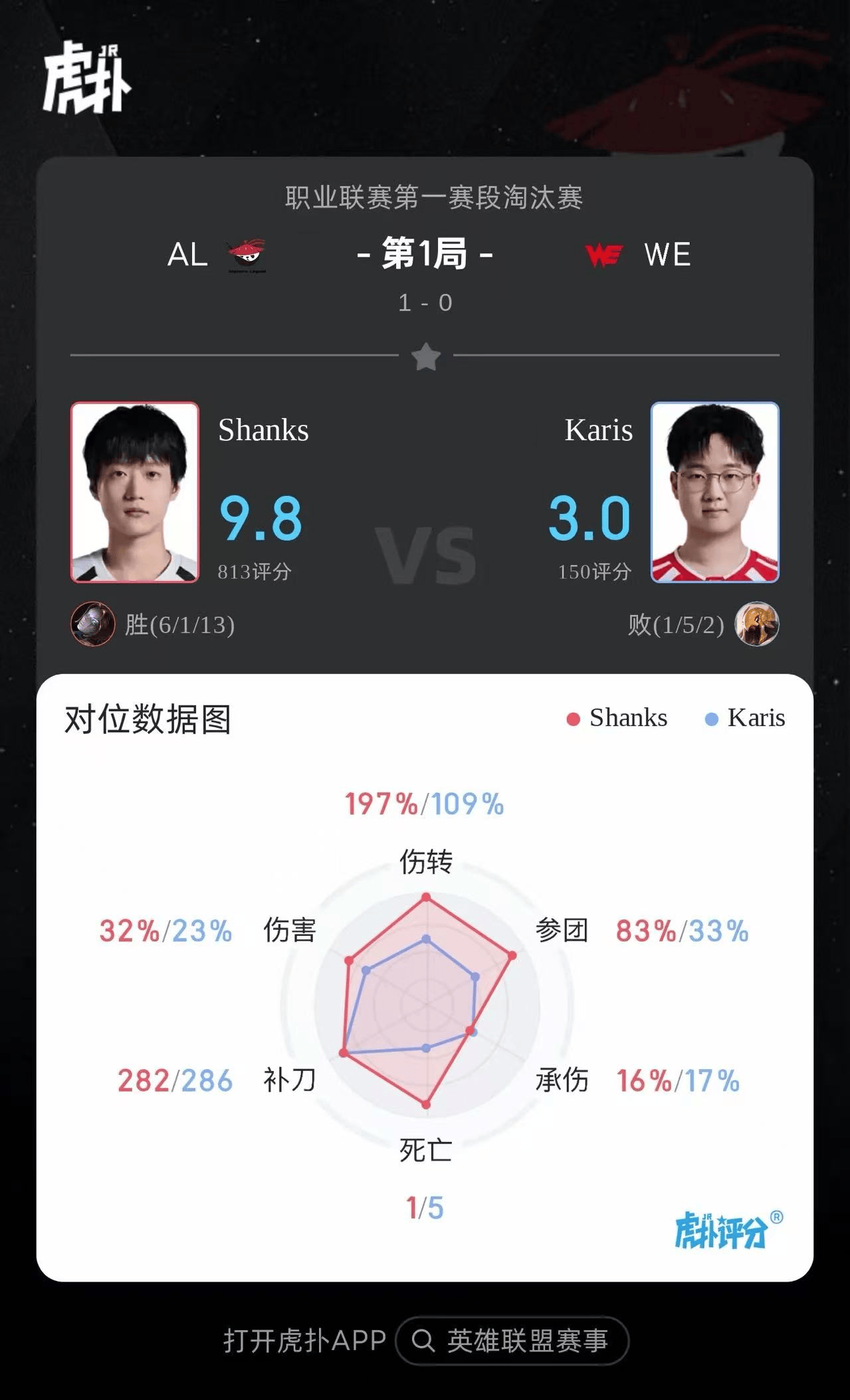 虎扑02月24日讯在刚刚结束的AL对阵WE的BO5比赛中,Shanks发条打出6/1/13战绩,斩获AL对阵WE第一局MVP