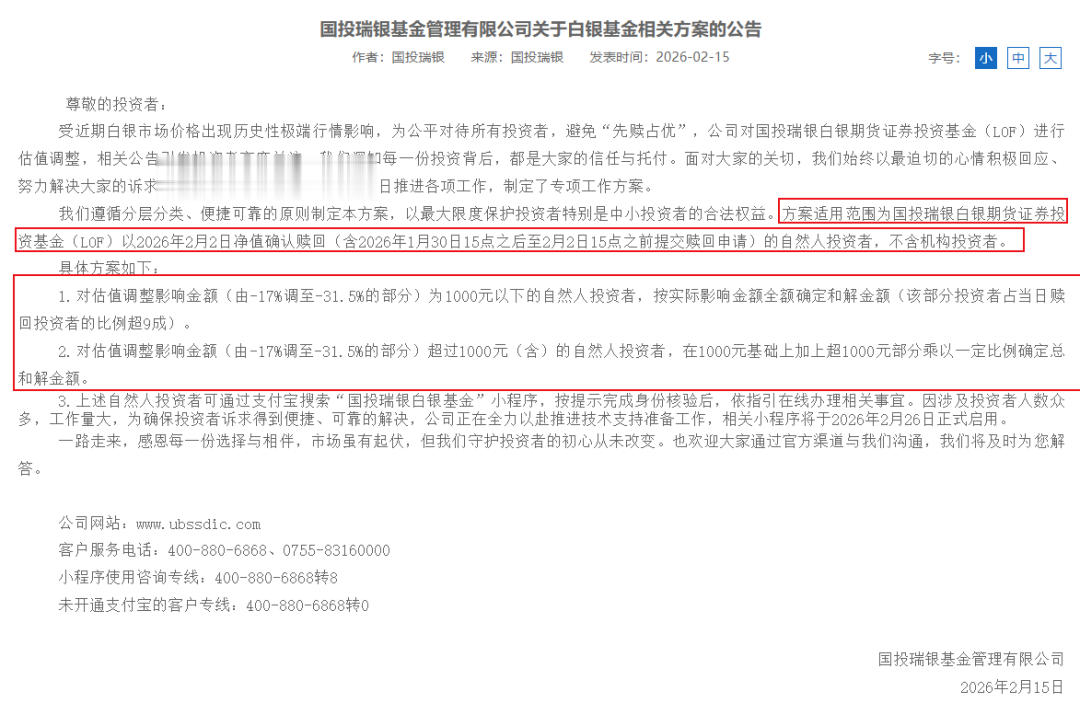 这一和解方案源于2月15日国投瑞银基金的公告。因国际白银期货史诗级暴跌,2月2日晚,国投白银LOF更新的净值数据显示,其A类份额单位净值从前一交易日的3.28元骤降至2.25元,净值从预估的-17%大幅下调至实际的-31.5%,创下公募单日最大跌幅纪录,引发投资者争议。公司针对1月30日15点-2月2日15点赎回的个人投资者进行补偿。