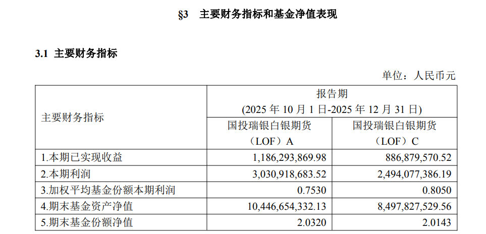 国投白银LOF成立于2015年8月,截至2025年年末,国投白银LOF基金A和C类份额合计净资产规模为189.44亿元,较2025年三季度末的66.4亿元增长超180%;该基金2025年第四季度利润合计55.25亿元,较前一季度的9.84亿元,增加461.48%。