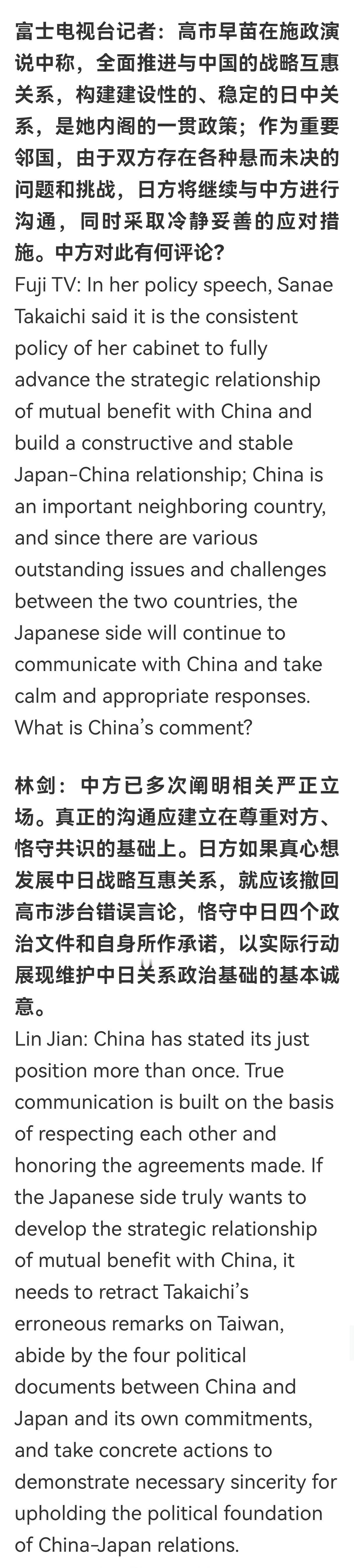 2026年2月15日至23日外交部发言人林剑答记者问共八个问题,日本提了两个:一是想问为啥中国没祝贺高市新内阁,二是日本想继续和中国加强合作。在日本没有纠错之前,我们的态度很坚决,要求也很明确,那就是:我们再次敦促日方反思纠错,恪守中日四个政治文件精神和自身所作承诺,以实际行动展现维护中日关系政治基础的基本诚意。既然日本政府没有基本的诚意,那其他问题先搁一边,不急!