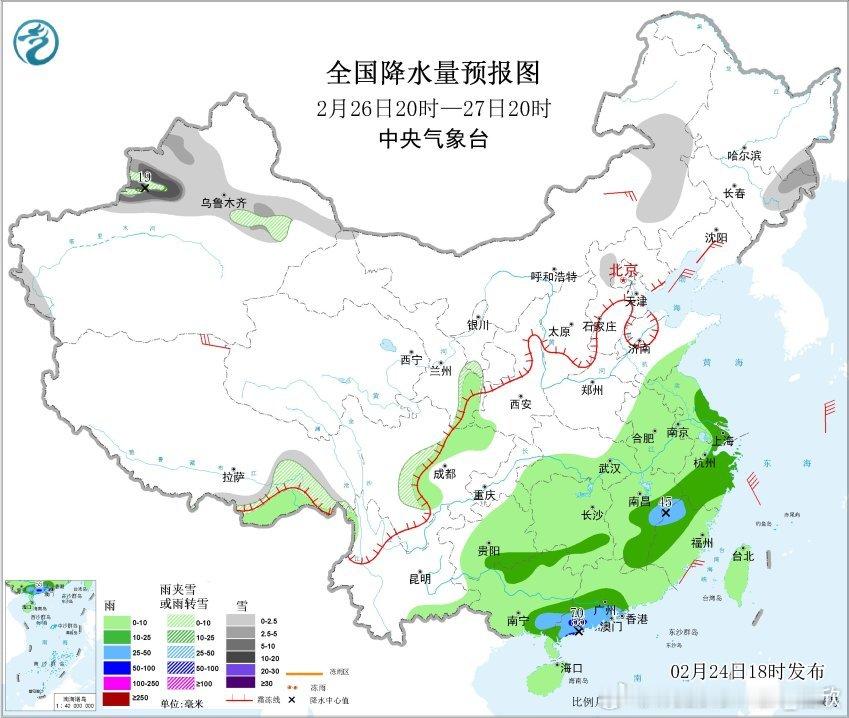 【南方多雨】昨晚到今天,新疆北部昨晚到今天出现较大范围降雪。未来3天,新疆天山沿线还有降雪,局地有大雪,27日天山西段局地有暴雪。此外因为有气旋东移,内蒙古东部、黑龙江西部,今晚到明天有中到大雪。
