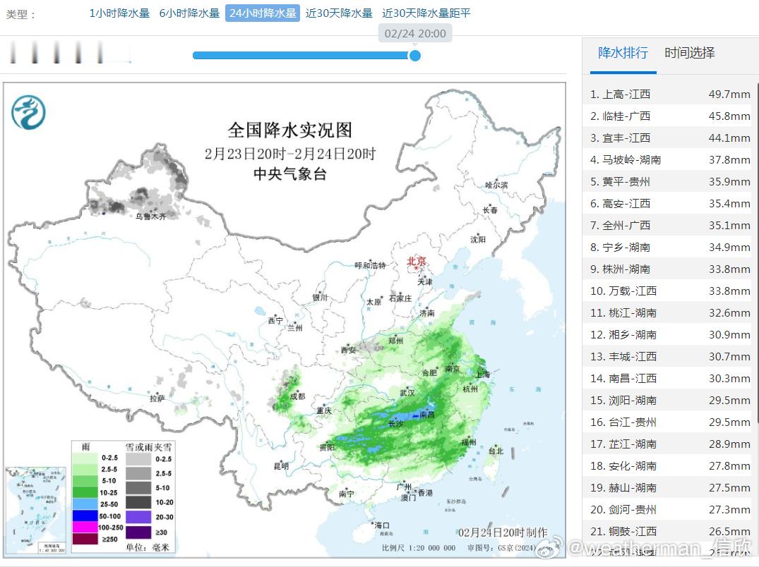 昨晚到今天,南方出现大范围降雨,今天白天雨势减弱。今晚到明天,南方的降雨总体不强,分布也相对零散。25日晚-26日,南方降雨再次明显增强。26日降雨核心区在江南,尤其是江西北部可能有暴雨。