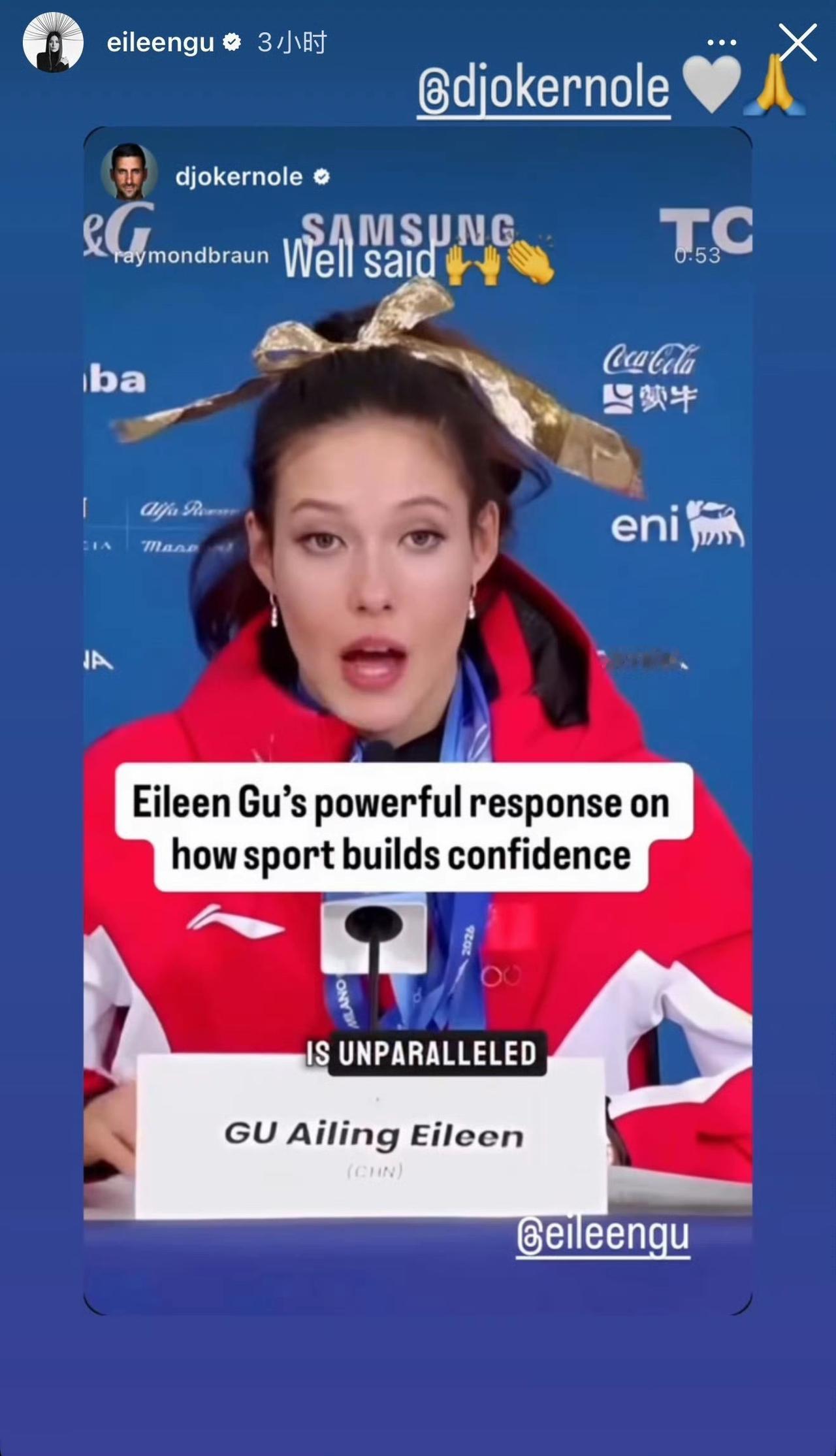 难怪青蛙公主商业价值比郑钦文都要高,说话的情商太高了……德约都想跟他互动。 1、谷爱凌:“我有个想法,但我不敢说,要做个动作成女子历史第一。” “U槽里双空翻,成为女子历史第一,我想挑战一下。” 2、谷爱凌谈到自己中间的名字来自姥姥冯国珍,她的名字由三部分组成:母亲(姓氏),姥姥(中间名字),早逝的小姨(名字)。 3、德约科维奇再次转发谷爱凌霸气发言,而且在米兰冬奥会期间互动三次。