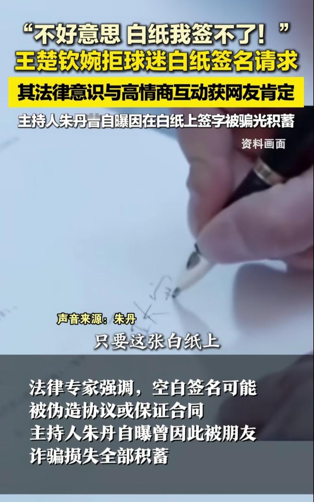 谁能想到签个名也藏着大风险?王楚钦最近婉拒球迷白纸签名的请求,这波操作直接被网友夸爆,看似只是一件小事,却藏着满满的细心和清醒,换谁看了都得说一句考虑周全。 面对球迷递来的白纸,王楚钦礼貌又坚定地拒绝,还会贴心找其他载体帮球迷签名,既没扫球迷的兴,又守住了自己的底线。这份清醒的法律意识,在当下真的太难得,也让大家看到了他私下里的沉稳。 这事儿也让人想起朱丹的惨痛经历,她曾自曝在白纸上签过名,结果被人利用,变成了千万借款的担保人,最后不仅被骗光积蓄,还不得不卖房还债,想想都觉得后怕。 生活里看似不起眼的小细节,往往藏着意想不到的坑。一张白纸,签上名字可能就成了有法律效应的凭证,不管是谁,多一份警惕,多一点法律意识,总归是没错的,这也是对自己最基本的保护。