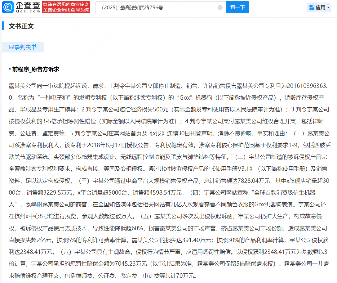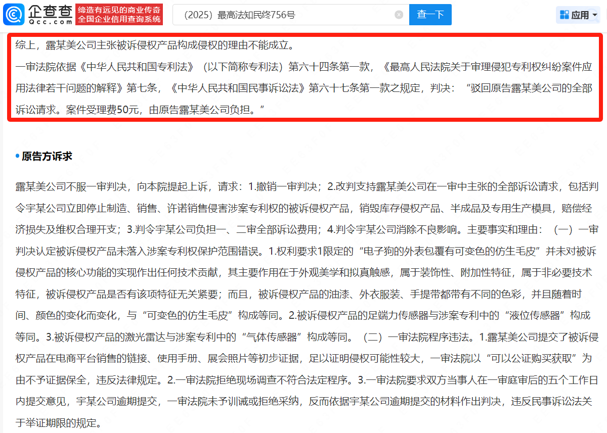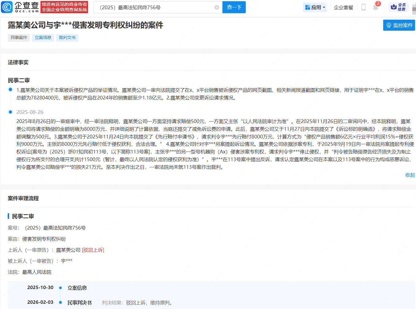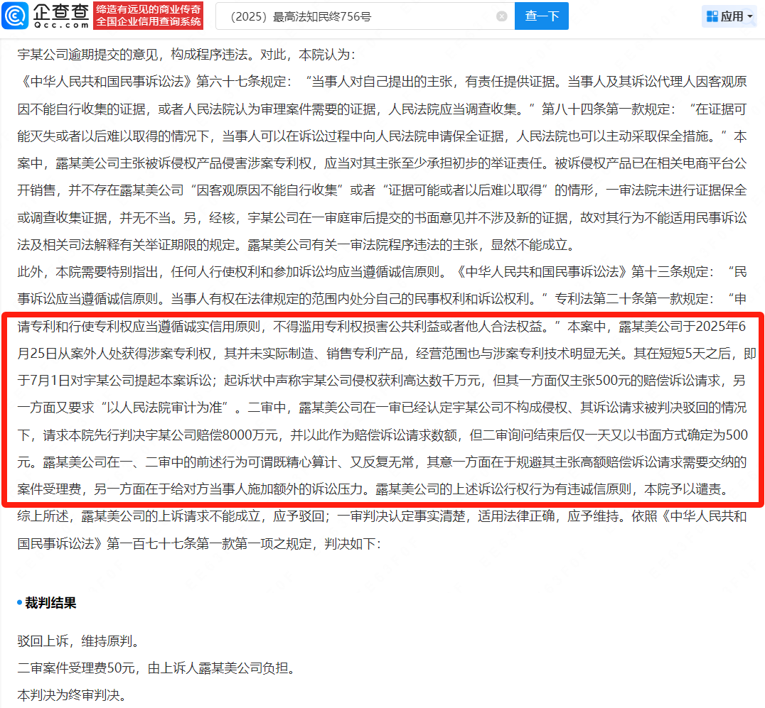 案件流程信息显示,去年7月,杭州露韦美日化有限公司起诉杭州宇树科技股份有限公司侵害发明专利权,起诉状中声称宇树公司侵权获利高达数千万元,该案于去年8月在杭州中院开庭审理。9月26日,杭州中院对该案作出一审判决,驳回原告的全部诉讼请求。原告不服提起上诉,法院二审维持原判,并指出露韦美公司在一审已经认定宇树公司不构成侵权、其诉讼请求被判决驳回的情况下,请求法院先行判决宇树公司赔偿8000万元,并以此作为赔偿诉讼请求数额,但二审询问结束后仅一天又以书面方式确定为500元,前述行为精心算计、反复无常,意在规避高额诉讼费并向对方施压,其诉讼行为违背诚信原则,依法予以谴责。