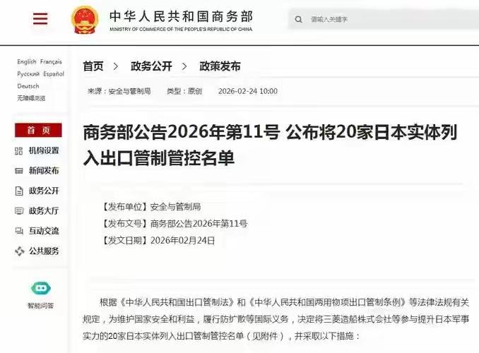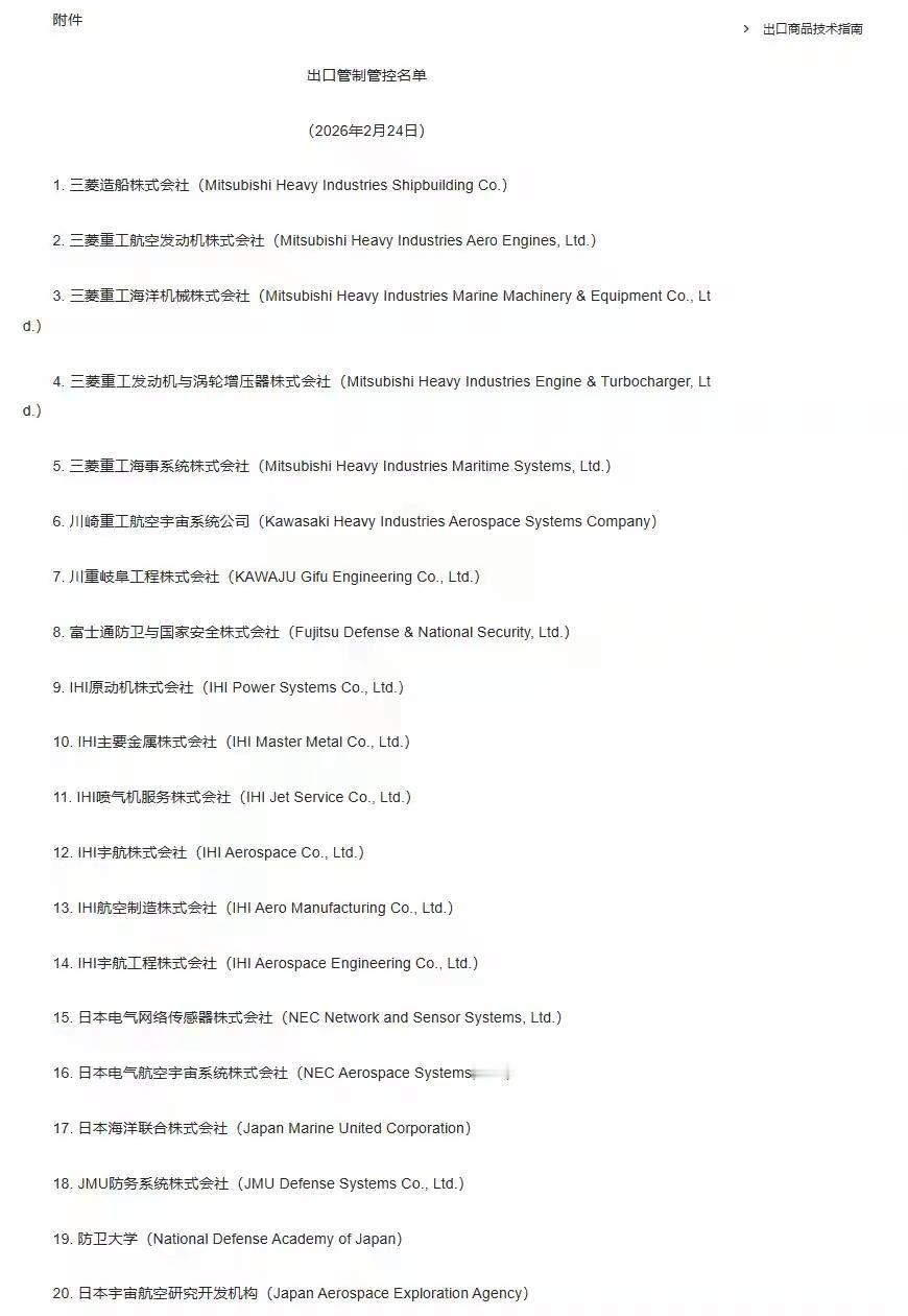 中国重磅制裁日本20家涉军企业,日本想玩“曲线救国”,痴心妄想! 商务部发布公告,将三菱造船株式会社等二十家参与提升日本军事实力的日本实体列入出口管制管控的名单,禁止向这些实体出口两用物项。 这20家企业太不讲究,我们给你稀土,你却帮助发展日本军工,失去信誉,制裁你,两个字“活该”!中国出手管制,就是对军事化动向的明确反制,守住供应链安全底线。 在日本,和军工联系的企业不只这20家,这次就是“杀鸡给猴看”,其它企业要注意了。只要你本着互利共赢,认真做民用,认真做普通经贸,我们都支持。谁敢蹚浑水,惩罚不隔夜! 中方对日实体实施出口管制意味什么 荷兰新内阁如何应对国际挑战 默茨访华有何“深意”