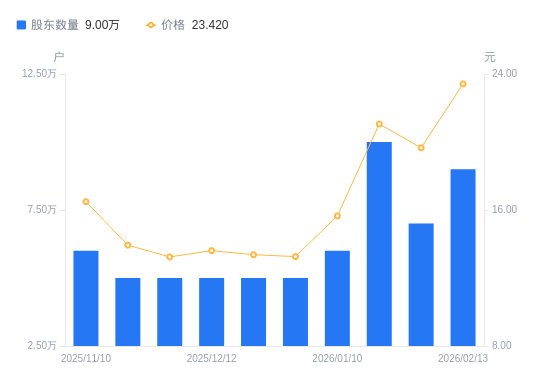 日期A股户数(户)流通A股户均持股数(股)户均持股市值(万元)2026-02-13900002911.996.822026-01-31700003743.997.362026-01-211000002620.805.522026-01-10600004367.996.842025-12-31500005241.596.952025-12-20500005241.597.012025-12-12500005241.597.132025-11-30500005241.596.942025-11-20500005241.597.302025-11-10600004367.997.20