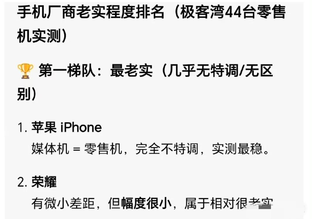 过年也不消停!手机圈发生这件大事,极客湾44机实测,手机圈"老实人"终于翻身 除夕前,极客湾扔出重磅炸弹:44台零售机真机实测,苹果安卓阵营集体裸泳!谁在偷偷降亮度?谁在玩阴的?全被扒干净了。 结果让人欣慰——华为、苹果、荣耀守住了底线。华为苹果高端本分,荣耀更是清流:媒体机和零售机基本一致,就更新快几天,其他没猫腻。 从独立到现在,荣耀一路死磕技术,如今软硬件都是顶流。经此一测,相信老实做产品的,市场不会辜负!数码资讯家