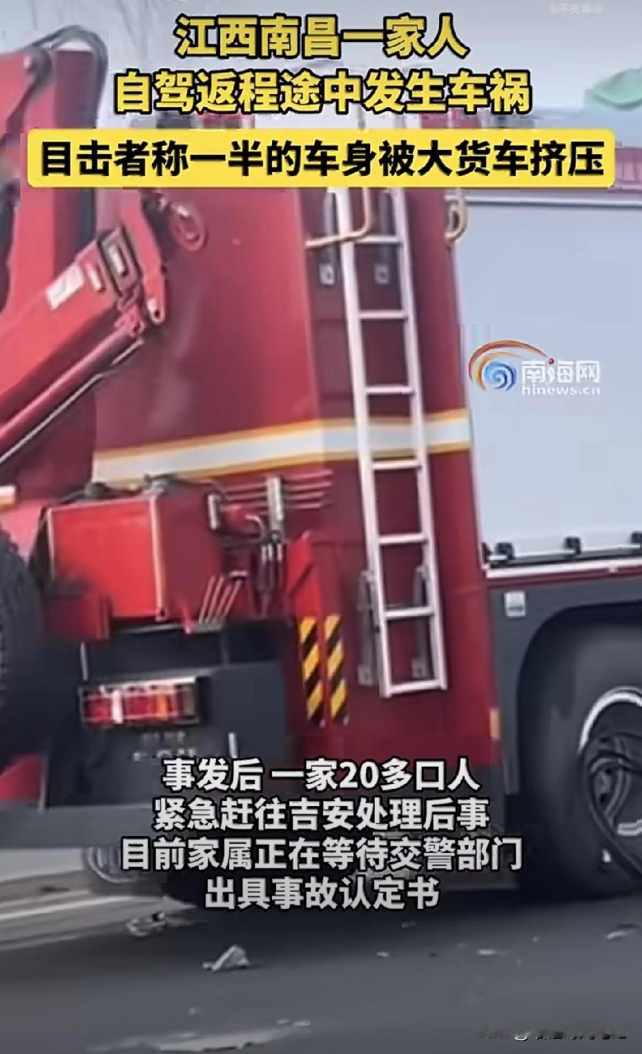 江西一家人自驾返程出车祸1死4伤。年初七,江西高速。一辆小客车,被大货车挤压在护栏上,车身变形如揉皱的纸团。一家五口,从娘家返程。姐姐走了,姐夫和三个孩子活了下来。 年后返程高峰,多少家庭都是这个剧本:回趟老家,看看父母,塞满一后备箱土特产,然后赶回去上班。我们整视乎都在默许这种“疯狂”。春节假期太短,所以必须赶路;高速免费有时限,所以必须卡点;假期余额不足,所以必须透支。 我们像一群被鞭子驱赶的羊群,在既定轨道上狂奔。这一家子也不例外,从娘家回南昌,可能就是想着"再不走要堵车了",或者"孩子作业还没写完"。谁能想到,这一脚油门踩出去,家就缺了一角。 当我们把"效率"凌驾于"安全"之上,把"打卡"看得比"陪伴"更重,把"返程"变成一场与时间的赌博,我们其实在用家人的生命,去兑换一张名为"正常生活"的入场券。 一半车身被大货车挤压。那辆小车就像个易拉罐被踩扁了一样。大车盲区大、刹不住、重心高,面对几十吨的钢铁巨兽一旦出事,小车就是鸡蛋碰石头。 可现实中,多少小车敢在大车旁边变道、抢道、甚至别车?这次事故具体责任还没认定(交警说正在调查),但"挤压"这个词本身就说明,小车大概率是被迫挤到了死角。高速行车中那份谨慎是不是该多几分? 团圆不是赶出来的,安全不是赌出来的。当把返程变成竞速,赌上的不是时间,是再也回不去的家。愿逝者安息,愿生者警醒。🙏 (本文信源基于南国都市报公开报道整理,事故具体原因及责任认定以交警部门最终通报为准。文中观点为作者个人看法,不代表任何官方立场。如有信息偏差,欢迎指正。)