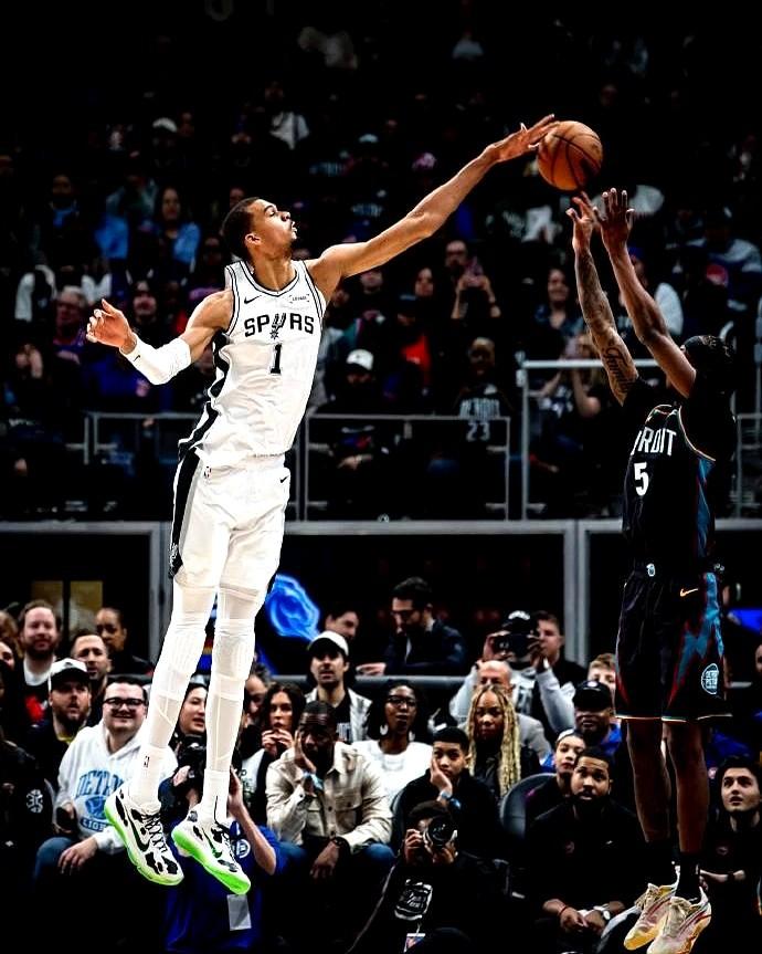 文班亚马这身体,怎么看都不像是地球人该有的。 官方身高更新到7英尺4英寸(约2米24),但臂展数据还停在2米44。按这个新身高比例算,真实臂展可能已经奔着2米50去了。 你看照片就知道有多夸张。脑袋和躯干显得特别小,两条胳膊和两条腿却长得不成比例,像是电脑特效做出来的。 这种身体条件在球场上就是降维打击。最近一场比赛,他轻松拿下21分17篮板外加6个盖帽。对手突破,他原地不动伸个手就行,防守面积覆盖半个禁区。 别人打球靠技术,他直接开物理外挂。