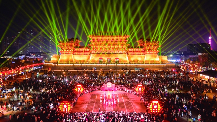 游客在河南省洛阳市隋唐洛阳城国家遗址公园欣赏演出。新华社图