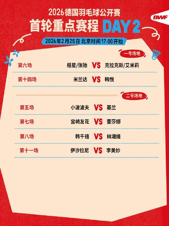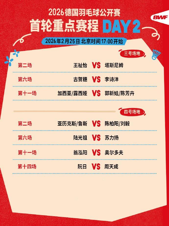 虎扑02月25日讯2026年德国羽毛球公开赛第二比赛日今日展开争夺,国羽共出战九场比赛。