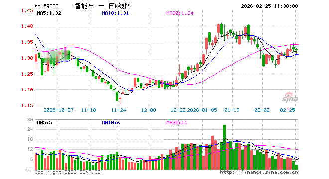 2月25日,截止午间收盘,智能汽车ETF华夏(159888)跌0.23%,报1.323元,成交额358.80万元。智能汽车ETF华夏(159888)重仓股方面,拓普集团截止午盘跌0.95%,豪威集团涨0.72%,科大讯飞跌1.47%,比亚迪涨1.07%,长安汽车涨0.27%,赛力斯涨0.93%,芯原股份跌5.58%,立讯精密涨1.07%,北京君正涨1.51%,德赛西威涨0.50%。