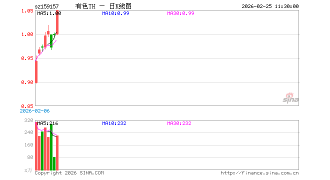 2月25日,截止午间收盘,有色金属ETF天弘(159157)涨5.22%,报1.049元,成交额2.28亿元。有色金属ETF天弘(159157)重仓股方面,洛阳钼业截止午盘涨4.11%,北方稀土涨9.99%,中国铝业涨5.94%,兴业银锡涨4.38%,云铝股份涨3.92%,铜陵有色涨3.99%,江西铜业涨3.71%,厦门钨业涨8.93%,中金黄金涨2.35%,西部矿业涨6.20%。