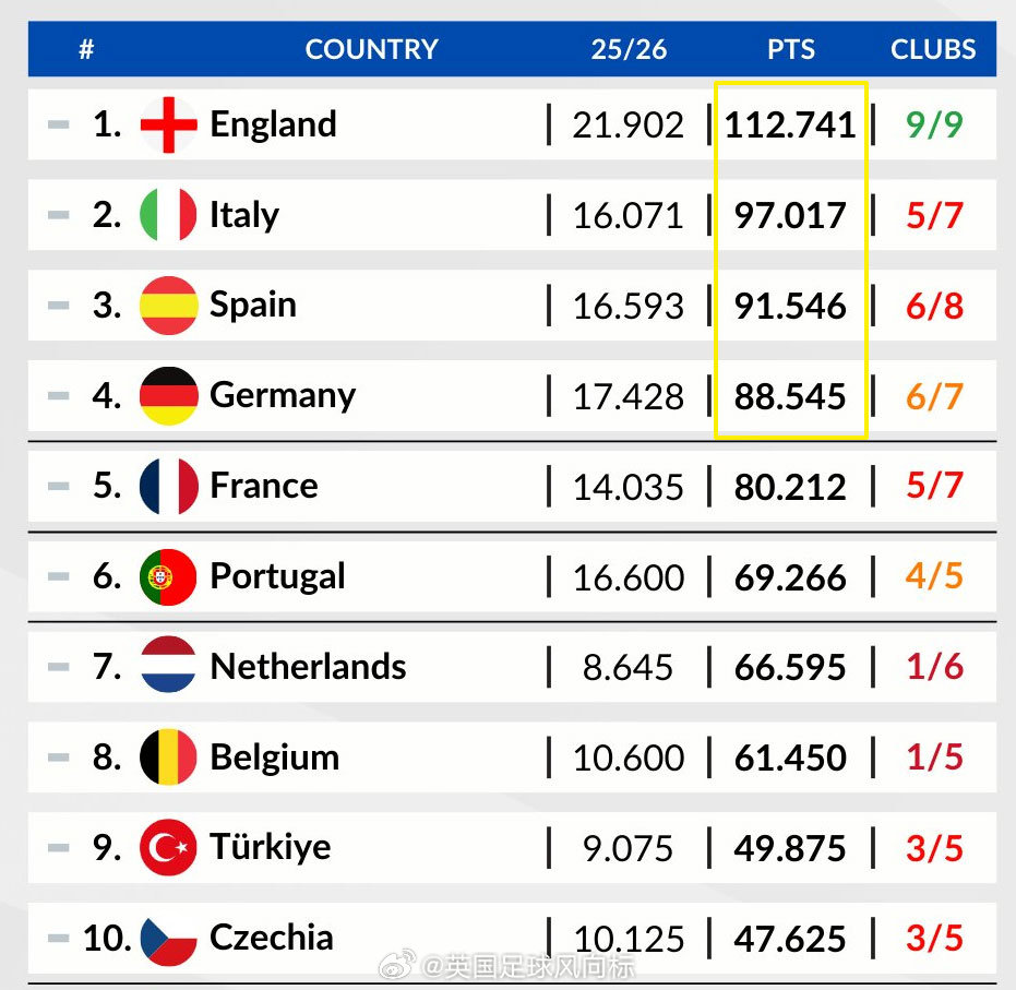 【英超6队晋级欧冠16强】本赛季参加欧冠联赛的6支英超球队,阿森纳+切尔西+利物浦+曼城+纽卡斯尔+热刺,全部晋级16强淘汰赛。英超球队的欧战积分(图2),真正做到了“遥遥领先”,下赛季继续5个欧冠名额,已经是毫无悬念。另一个5队踢欧冠的联赛,将在意甲与西甲之间产生。