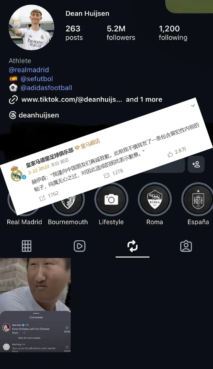 2月21日,皇马后卫赫伊森在个人社媒转发涉及“辱华”内容多图动态被曝光,尽管他删除了这一动态,但争议并未就此平息。2月22日,皇马官方微博账号发布了50余字的道歉声明,但并未同步到更具有国际影响力的皇马官方网站以及皇马官方在Facebook、X、IG等国际平台社媒,当事人赫伊森也未在个人社媒账号道歉。