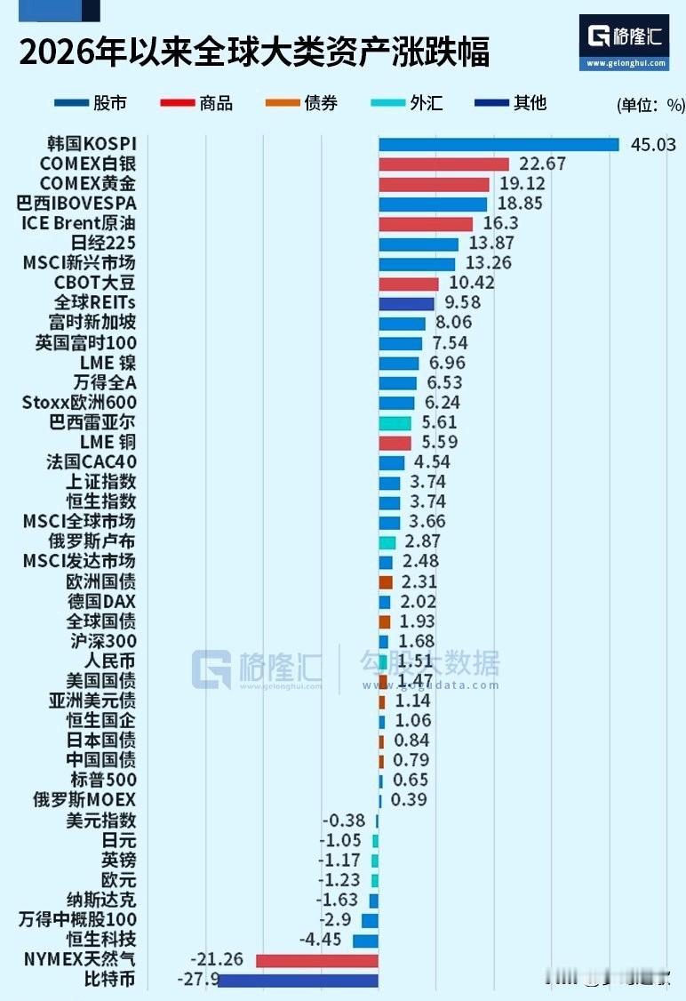 韩国股市冠绝全球 已经突破了6000点,甚至涨幅超过金银 韩国股市自从2025年以来,出现了大幅上涨。主要就是2025年人工智能的爆发,彻底激活了韩国的科技股,加上总统竞选口号“KOSPI 5000并不难,相信我就该对股市更感兴趣”。 韩国股市以超45%的涨幅成为全球第一,甚至黄金,白银懂王暴涨都没有跑过韩国股市。 这次韩国股市的上涨基本基本上是外资推动的结果,毕竟KOSPI整体PE约10倍,是全球主要市场中最便宜的指数之一。 最主要的是在科技股方面有独特的优势,- 半导体龙头估值(三星约8倍、SK海力士约6倍)远低于全球水平,成为最大的受益者。