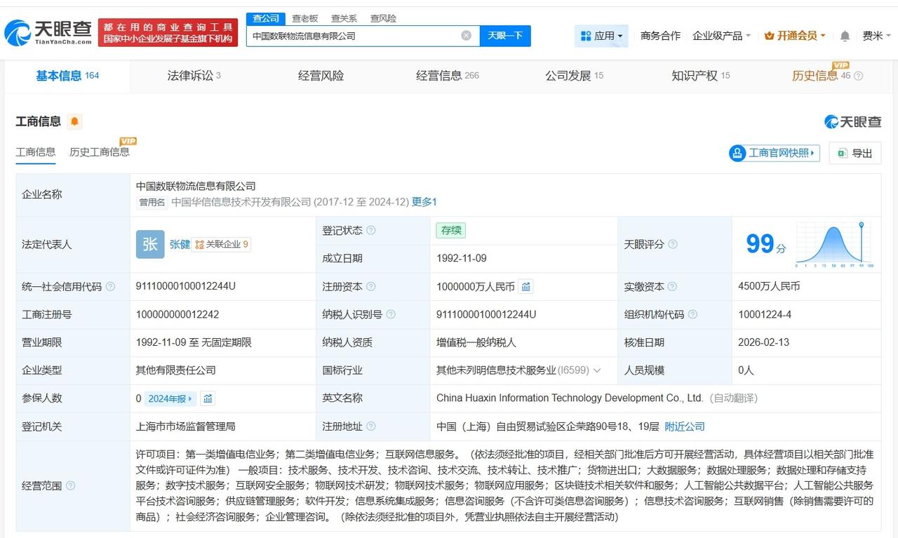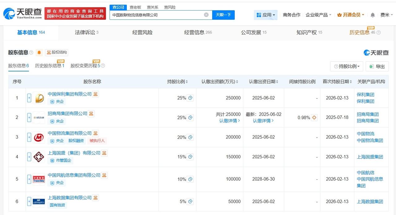 中国数联物流信息公司增资至100亿 增资约22122% 天眼查App显示,近日,中国数联物流信息有限公司发生工商变更,新增中国保利集团有限公司、中国物流集团有限公司等为股东,同时注册资本由4500万人民币增至100亿人民币,增幅约22122%。 该公司成立于1992年11月,法定代表人为张健,经营范围包括第一类增值电信业务、第二类增值电信业务、互联网信息服务等,现由招商局集团有限公司及上述新增股东等共同持股。 天眼查信息: