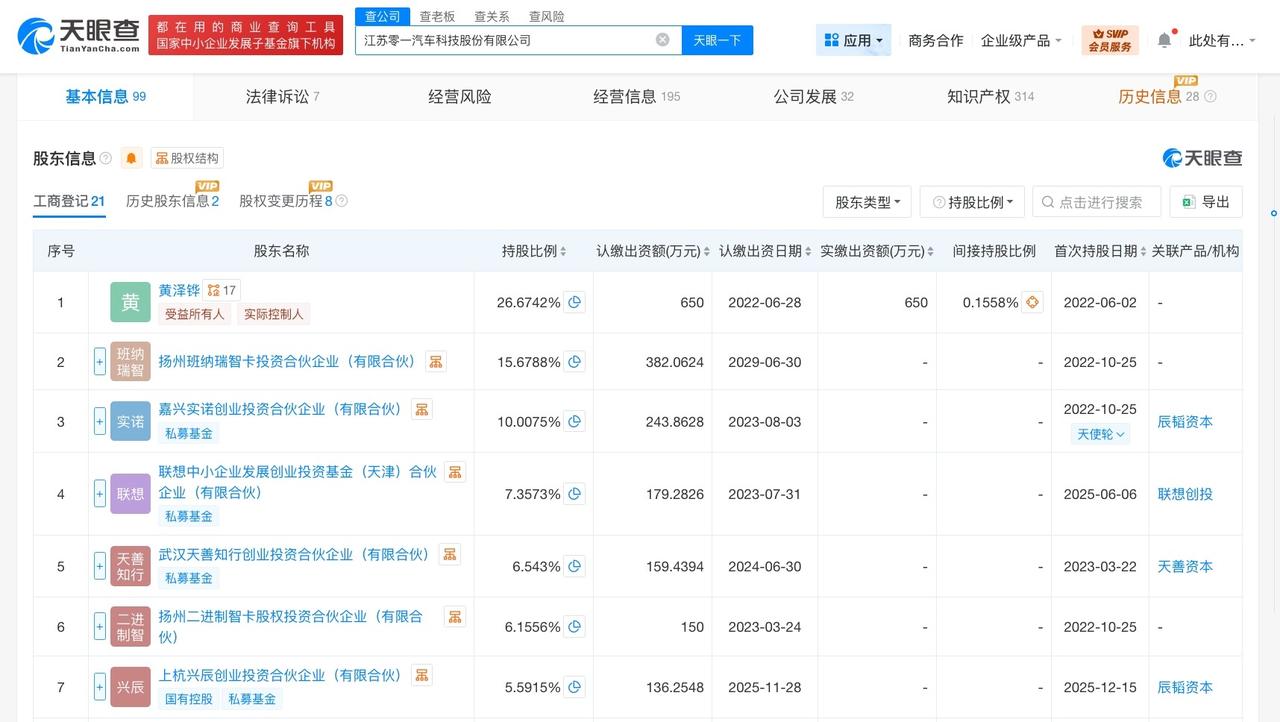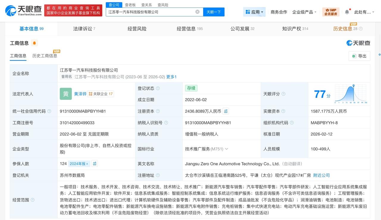 零一汽车变更为股份公司 零一汽车公司更名 天眼查App显示,近日,江苏零一汽车科技有限公司发生工商变更,企业名称变更为江苏零一汽车科技股份有限公司。 该公司成立于2022年6月,法定代表人为黄泽铧,注册资本约2436.8万人民币,经营范围含新能源汽车整车销售、汽车零配件零售、人工智能行业应用系统集成服务、人工智能应用软件开发、信息系统集成服务、智能控制系统集成、信息系统运行维护服务、新能源汽车换电设施销售等。股东信息显示,该公司由黄泽铧、扬州班纳瑞智卡投资合伙企业(有限合伙)、嘉兴实诺创业投资合伙企业(有限合伙)等共同持股。 天眼查信息: