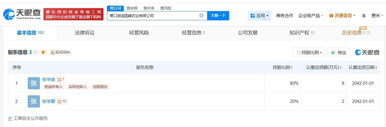 起底草莓360元一斤关联公司 草莓360元一斤公司多年参保人数为0 草莓360元一斤公司注册资本仅10万葡萄330草莓360元一斤网友惊呆 据媒体报道,近日,有辽宁网友发视频称,在高速上看到了“葡萄330元1斤、草莓360元1斤”的广告牌。对此,工作人员回应称此事属实,据悉,水果是由辽宁营口澍诚国峰农业有限公司种植。 天眼查App显示,营口澍诚国峰农业有限公司成立于2022年1月,法定代表人为张学森,注册资本10万人民币,经营范围包括食品小作坊经营、食品销售、道路货物运输等,由张学森、张学霖共同持股。年报信息显示,该公司连续多年参保人数为0。 天眼查信息: