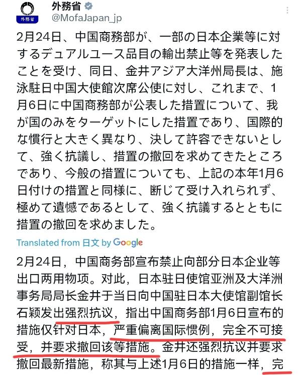 日本出来回应了!在我们将20家日本实体纳入管制清单之后,日本非常的愤怒!2月24日,日本外务省发表声明声称,中国商务部宣布对部分日本企业等实施两用物项出口禁令,日本已经对中国驻日本大使馆公使提出交涉。此前,针对中国商务部1月6日公布的相关措施,日本方面已明确表示:该措施仅以日本为对象,与国际通行惯例严重不符,绝对无法接受,并已提出强烈抗议,要求中方撤销相关措施。 1月6日,中国商务部发了个公告,加强对日本的两用物项出口管制。 啥叫两用物项?简单说,就是那些民用但也能军用的东西,比如高科技材料、设备啥的。 中国这么做,是担心这些玩意落到日本军事手里,帮助他们扩军。 中国外交部反复强调,这是维护国家安全,履行国际义务,完全合情合理。 公告一出,日本那边就炸锅了,官房长官跳出来说无法接受,强烈抗议,还通过外交渠道向中国施压 可中国没松口,继续观察日本动向,转眼到了2月24日,中国商务部再放大招,直接公布名单,把三菱重工的造船分公司、航空发动机公司等20家日本实体列入管控名单。 这些公司干啥的?很多都涉足军工,比如造军舰、飞机引擎,还有宇宙航空研究机构,明显能提升日本军事实力。 中国明确规定,禁止向这些实体出口两用物项,还禁境外转口,特殊情况才批。 这不是针对所有日本企业,只瞄准那些有风险的,正常贸易不受影响。 日本听到这个消息,反应可大了,外务省当天就发声明,声称中国措施只针对日本,不符国际惯例,已向中国大使馆公使交涉。 之前针对1月公告,日本就抗议过,现在又来一轮,更生气了,日本媒体也跟风炒作,说这会打击日本经济,影响供应链稳定。 你们想想,日本那些大企业,像三菱、斯巴鲁,本来依赖中国原材料和技术,现在被管制,采购成本肯定涨,生产链条得调整。 有些分析说,这可能让日本半导体、汽车产业受挫,因为中国是全球最大市场和供应商。 日本政府呢,还在叫嚷,要求中国撤销名单,不然就采取反制。可现实摆在那,日本自己不反思,为什么偏偏它成了目标?其他国家没这待遇啊。 日本这些年军事动作太多,突破宪法底线,邻国当然警惕,中国这步棋,是在用经济手段回应军事威胁,挺聪明的一招。 日本的回应,也暴露了他们的心态,他们说中国措施不符国际惯例,可你们知道吗?美国早就对很多国家实体列单管制,中国这是在学国际做法。 像华为被美国封杀时,日本企业也得遵守,现在轮到日本自家企业了,他们就喊不公。这不就是双标吗? 日本外务省交涉中国公使,还威胁评估影响后反制,可能限制中国产品进口,或在国际组织投诉。 可这有用吗?中国立场坚定,不会轻易让步,想想过去,中美贸易战时,中国也没退缩,这次对日本也一样。 事件发展到现在,日本企业开始游说政府,担心生意受损,有些日本公司已公开表态,会配合审查,争取移出名单。 这说明,经济压力在起作用,日本政府如果聪明,就该反思政策,调整对华态度,而不是一味对抗。 拉长视线看,这事影响不小,中日作为邻国,经济高度互补,日本出口中国占大头,中国是日本最大贸易伙伴。 管制名单一出,可能导致双边贸易额下滑,影响全球供应链。汽车、电子产业最先感受到痛,日本车企像斯巴鲁,本来用中国零部件,现在得绕道,效率低。 日本如果继续军事化,中国措施可能升级,其他国家也可能跟进,形成围堵。 日本民众呢?他们本就不爱军费上涨,现在经济受挫,更会不满政府,反观中国,这步棋提升了国际话语权,展示维护安全的决心,其他亚洲国家看到,也会警醒,别轻易卷入大国博弈。 咱们老百姓看这事,得明白,国家安全不是儿戏,中国这么做是为咱们好,保护家园。 这件事提醒大家,和平发展才是正道,中日应多合作,少对抗,推动友好关系。