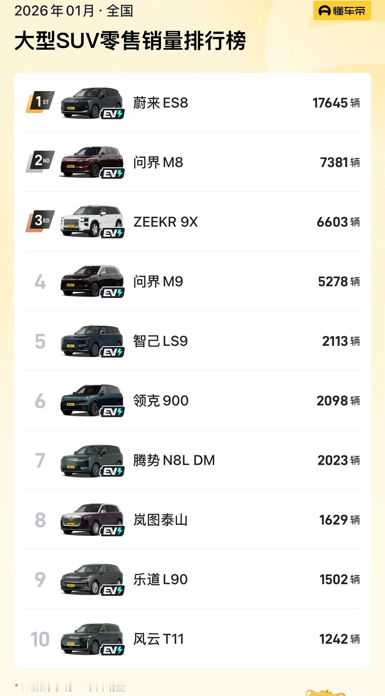 不看不知道,一看吓一跳,凭啥均价40多万的国产车,卖得比BBA还好?[笑哭]很多人觉得,要是自己有40多万,都会去买辆BBA。然而现实情况是,很多人选择了问界M9,看这个销量情况就知道,问界M9月销都是大几千辆,甚至去年还能月销上万辆,在大型SUV品类的里面排名遥遥领先,而且大型SUV前10名全是国产…… 其实说白了,问界M9能卖这么好,一是智驾靠谱,而是空间够大、动力也够强,同配置的BBA少说也得上百万了。如果你就40多万,想买一台大型SUV,说实话选择真不多。身边好多原来开四五十万价位BBA油车的,换车换了问界,你让他们继续花上百万去买BBA那也不现实没那么多💰,换同价位BBA的话,说实话和原来的老车用不出质的区别,但是换问界M9,能。