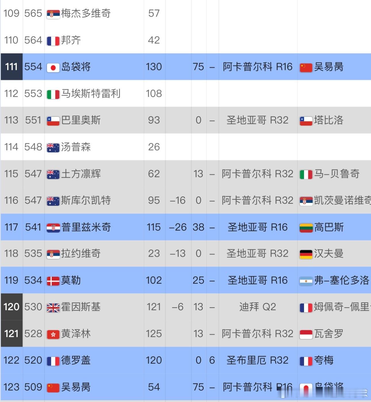 吴易昺击败鲁德后,积分来到509,即时排名上升到123位;