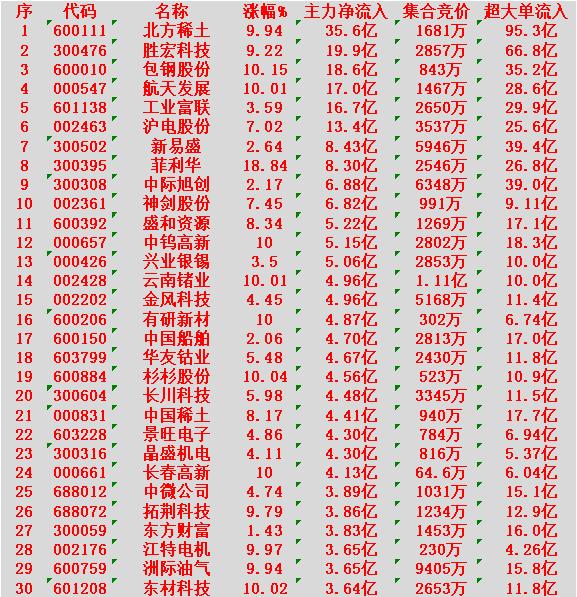 2月25日收盘,主力资金,已经大幅卖出的30名单: 昆仑万维:净流出 18.5亿元 兆易创新:净流出 12.6亿元 协鑫集成:净流出 12.1亿元 天孚通信:净流出 11.2亿元 蓝色光标:净流出 9.29亿元 亨通光电:净流出 7.79亿元 网宿科技:净流出 7.34亿元 中国中免:净流出 7.31亿元 三花智控:净流出 7.14亿元 中国核电:净流出 6.99亿元 2月25日收盘,主力资金“大幅买入”的30名单: 北方稀土:净流入 35.6亿元 胜宏科技:净流入 19.9亿元 包钢股份:净流入 18.6亿元 航天发展:净流入 17.0亿元 工业富联:净流入 16.7亿元 沪电股份:净流入 13.4亿元 新易盛:净流入 8.43亿元 菲利华:净流入 8.30亿元 中际旭创:净流入 6.88亿元 神剑股份:净流入 6.82亿元 盛和资源:净流入 5.22亿元 中钨高新:净流入 5.15亿元 兴业银锡:净流入 5.06亿元 云南锗业:净流入 4.96亿元 金风科技:净流入 4.96亿元 有研新材:净流入 4.87亿元 中国船舶:净流入 4.70亿元 华友钴业:净流入 4.67亿元 杉杉股份:净流入 4.56亿元 长川科技:净流入 4.48亿元