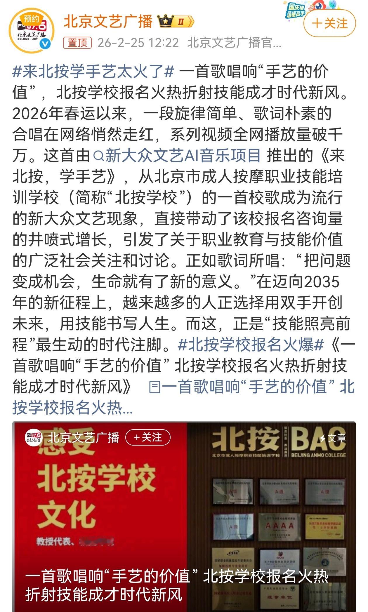 来北按学手艺太火了 这段时间被“来北按学手艺”这首歌刷屏了,觉着这首歌火的背后,其实就是大家心里面对“手艺”价值的重新掂量。