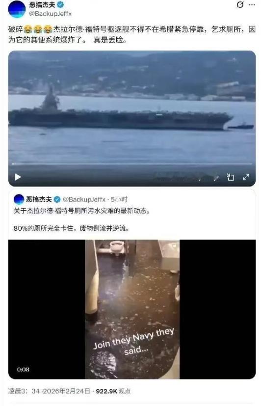 美国推迟攻击伊朗,因为航母上的粪便系统爆炸了 好家伙,一船的屎尿横流,这画面不敢想象,不忍直视。 可没想到,号称“海上堡垒”,美国最先进的核动力航母,还没到预定位置,就因为粪便排污系统出了故障,不得不紧急停靠在希腊的克里特岛苏达湾,说白了就是去求希腊帮忙解决厕所问题,不然船上的人根本没法正常生活。 这艘航母上一共有650个厕所,这次坏了近九成,只剩下不到70个还能用,而船上住着4600多名船员,这么多人共用几十个厕所,难度可想而知。 船员们上厕所得排四五十分钟的长队,有时候排到了还可能用不了,更让人难受的是,因为排污系统故障,船舱里出现了污水溢流的情况,到处都是脏水,气味刺鼻得很,真正称得上是屎尿横流,那场面确实像大家说的,不敢想象、不忍直视。 有船员自嘲,说他们不是被敌人打败的,是被自己船上的马桶打败了。 这么先进的航母,怎么会连厕所都搞不好? 主要是福特号航母的厕所排污系统有先天的设计缺陷。 它用的不是咱们常见的普通冲水系统,而是一套高端的真空收集、储存和转移系统,初衷是为了节水,每次冲厕只用1.5升水,比传统系统省90%的水,还能节省船舱空间。 可设计师忽略了,航母不是豪华邮轮,是4600多人24小时轮班工作的作战平台,使用强度比邮轮大得多。 这套真空排污系统的管道设计得又细又多弯道,和船上的使用流量根本不匹配,容易沉积污物导致堵塞。 更麻烦的是,全舰的厕所被分成10个区域,采用串联设计,只要一个区域的一个阀门松动,或者一处管道被堵塞,整个区域的几十个厕所就全瘫痪了,就像一根吸管堵了,整杯饮料都吸不上来一样。 而且为了所谓的舱室分配灵活,船上取消了所有小便池,全用坐便器,男兵如厕效率大大降低,坐便器使用频率翻倍,进一步加重了管道负担。 除此之外,还有两个原因让故障更严重。 一是船员的不满情绪,这艘航母本来计划部署6个月,结果被强行延长到8个多月,长期在海上漂泊,船员们心态崩溃,有人就故意往马桶里扔异物,比如T恤、扳手,甚至1.2米长的尼龙绳,以此表达抗议,这就形成了恶性循环,堵塞越来越严重。 二是这套系统根本没法在海上彻底修复,管道里的钙质沉积只能靠港后用化学酸洗才能清除,单次维修成本就高达40万美元,自2023年以来,福特号已经请求了42次外部维修,问题一直没根治。 正是因为厕所故障太严重,福特号被迫紧急停靠希腊抢修,希腊还紧急提供了150个移动厕所,才勉强稳住船上的基本秩序。 而福特号作为美军威慑伊朗的关键力量,它一停,美军原本计划的双航母合围伊朗的部署就被打乱了,根本没有足够可靠的前线战力支撑攻击行动,这也是美国推迟攻击伊朗的直接原因之一。 当然,除了航母厕所的问题,美国推迟攻击还有其他考量。当时特朗普正要发表第二任期的国情咨文,这对他来说特别重要,他国内支持率不高,必须靠这场演讲稳住局势、争取支持,如果这时候发动战争,会抢走演讲的风头,得不偿失。 而且打击伊朗本身风险就大,伊朗的军事设施大多深埋地下,很难彻底摧毁,一旦开战,美国可能陷入长期冲突,伤亡增加,还会推高全球油价,冲击国内经济,这些都会影响特朗普的政治前途。 可能有人觉得,厕所这么小的事,怎么能影响到国家的军事行动?可事实就是这样,再先进的战争机器,也离不开最基本的生活保障。 福特号的尴尬,也暴露了美国军工的问题,他们过分追求装备的先进性,却忽视了实用性和可靠性,连厕所这种基础保障都没做好。 总的来说,美国推迟攻击伊朗,福特号航母的厕所故障确实是关键诱因,一艘连船员基本生活都保障不了的航母,根本没法执行高强度的作战任务,再加上美国国内的政治考量,推迟攻击也就成了必然。 这件事也让大家看清,美国的对外军事行动,从来都是围绕自身利益和国内政治转的,所谓的威慑,有时候也会被这些看似不起眼的小问题打败。