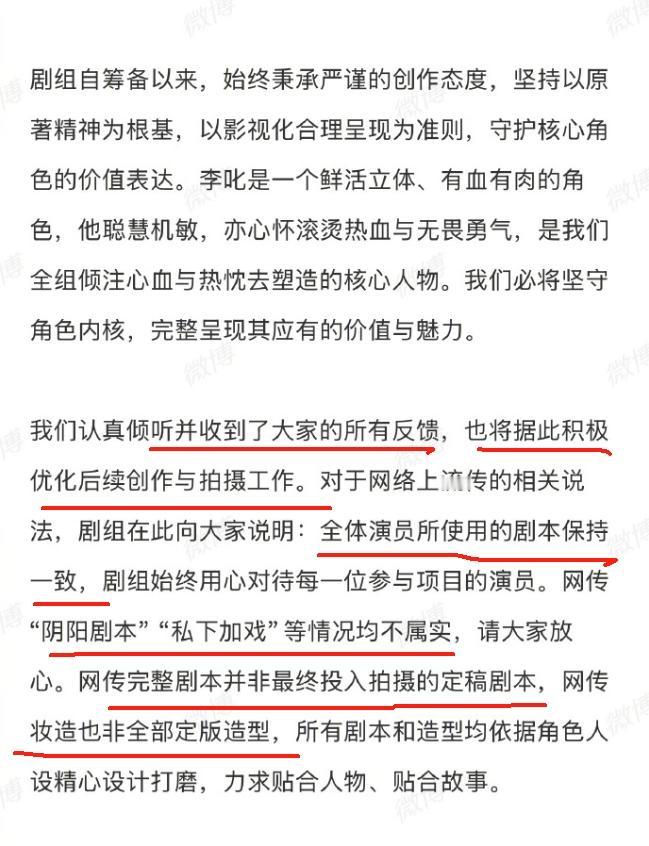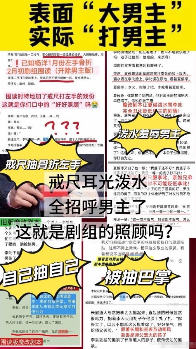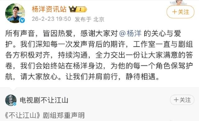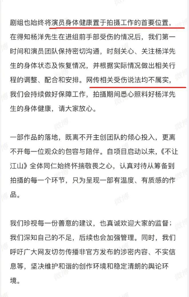《不让江山》剧组发布声明! 声明大概意思,网传剧本是真的,但不是最终定稿的版本,强调没有阴阳剧本,大家拿到的本子是一样的,声明杨洋受伤是在进组前,承诺会保证男主戏份,以杨洋的角色为创作核心,同时,杨洋工作室转发内容安抚粉丝,不过部分粉丝有点离谱了,已经开始扣剧本了,对剧本中戒尺打手,打耳光,以及泼男主水戏份不满意,就差亲自教编剧写剧本了,拿回男主高光戏份理所当然,但是一点委屈戏份也不想拍,就有点过分了,男主草根出身,前期受点委屈也是合理剧情。