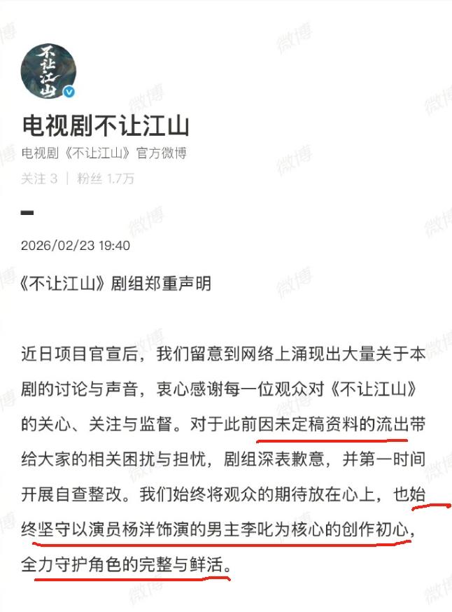 《不让江山》剧组发布声明! 声明大概意思,网传剧本是真的,但不是最终定稿的版本,