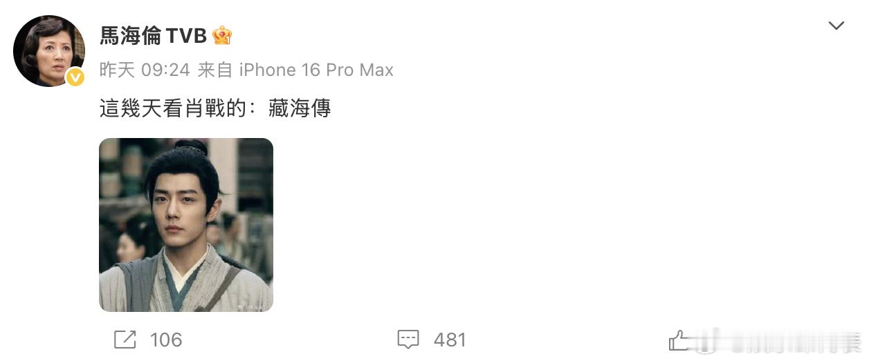 马海伦在看藏海传tvb演员马海伦在追藏海传 连发好几条微博,实时更新追《藏海传》进度中~