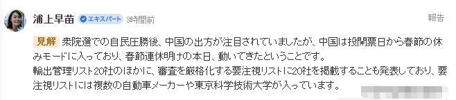 日本记者浦上早苗说了一段比较清醒的话!她表示,日本以为中方会软化立场,结果等来的却是当头一棒。中国此前之所以没有在第一时间反制日本,其实有两大原因。 同样叫“早苗”,一位是身居高位的首相高市早苗,一位是普通记者浦上早苗,后者一番清醒发言,直接戳破了前者的侥幸,狠狠打了日本政府的脸。   可能很多人没听过浦上早苗的名字,她常年关注中日关系和日本政坛动态,平时发言客观犀利,之前也多次就国际热点话题发表过理性看法,在日本有不少支持者。   这次浦上早苗发声,核心就是点醒日本政府,尤其是刚获得大胜的高市早苗,她直言,自从高市早苗带领自民党在众议院选举中拿下压倒性胜利后,整个日本都在等着看中方的反应,大家心里都没底。   浦上早苗的话,戳中了很多日本民众的心声,却狠狠打了高市政府的脸,要知道,高市早苗赢得选举后,姿态变得格外傲慢,仿佛手握胜券在握,完全没把外界的担忧放在眼里,一心要推进自己的政策。   这场大胜让高市早苗底气大增,连任首相后,她毫不掩饰自己的右倾立场,公开表示要修改和平宪法,把自卫队写入宪法,还要大幅增加防卫预算,强化日本的军事力量,甚至计划出口杀伤性武器。   浦上早苗看在眼里,急在心里,在发言中特意提到,中方此前一直没有动静,不是软弱,也不是没反应,而是在等合适的时机,一方面是恰逢中国春节假期,另一方面也是谋定而后动,做事格外稳妥。   她这番话,相当于直接反驳了日本政府的侥幸心理,高市早苗和她的团队,大概率觉得赢得选举就可以为所欲为,有西方盟友撑腰,中方不会有什么动作,所以才一副有恃无恐的样子。   浦上早苗却看得很透彻,她知道,中方向来做事沉稳,不打无准备之仗,一旦出手就会精准有力,她甚至隐晦提醒,日本政府现在最该做的不是傲慢逞强,而是认清现实,收敛自己的激进做法。   其实浦上早苗一直都很理性,之前美国雅虎撤出中国大陆时,她就曾客观评论,说雅虎在中国本来就没什么存在感,不应该把责任推给别人,这种理性视角,在当下的日本舆论圈格外难得。   反观高市早苗,连任后越发激进,不仅要推进修宪、扩军,还公开要求中方“采取负责任的行动”,一边说着要推进“战略互惠关系”,一边又频频做出挑衅举动,两面派的嘴脸暴露无遗。   日本国内也不是没人反对高市早苗,有政治评论员就警告,高市早苗这次大胜,很可能会开启“政治暴走”,一旦她误以为胜选全靠自己,听不进不同意见,只会把日本带入危险的深水区。   浦上早苗的发言,之所以能在日本引发热议,就是因为她说出了很多人不敢说的实话,在很多日本民众看来,高市早苗的右倾政策,只会让日本陷入孤立,损害日本的自身利益,得不偿失。   她的这番话,不是替中方说话,而是站在日本的立场上,理性分析局势,毕竟,日本的很多产业都依赖外部合作,中方作为日本重要的合作伙伴,一旦关系出现裂痕,日本的损失会很大。   可高市早苗似乎根本听不进这种理性声音,她身边的人透露,高市一旦下定决心,就不会听别人的意见,现在她手握大权,又有选举大胜的加持,很可能会一意孤行,推行自己的激进政策。   更让人担忧的是,日本在野党势力大幅萎缩,已经难以制衡高市早苗的权力,就连执政联盟的伙伴日本维新会,影响力也在下降,很难再对高市的政策形成制约,只能看着她一步步推进右倾路线。   日本国内还有不少像浦上早苗这样的理性人士,他们一直呼吁政府理性看待中日关系,不要一味地跟着西方站队,不要刻意挑衅,要通过对话沟通解决分歧,珍惜中日之间的合作基础。   毕竟,和平与发展才是当下的主流,国与国之间,没有永远的对抗,只有永远的利益,中日两国作为邻居,只有和平共处、互利共赢,才能让两国人民都获得实实在在的好处,才能实现共同发展。   希望高市早苗能早日清醒过来,收敛自己的激进做法,不要再把日本推向危险的边缘,珍惜中日之间的合作机会,推动两国关系重回正轨。   理性看待局势,懂得审时度势,才是一个合格的执政者该有的素养,浦上早苗的一番话,不仅点醒了日本政府,也让我们看到,不管在哪个国家,都有清醒的人,都渴望和平与合作。   邻里之间,难免有磕磕绊绊,关键是要互相理解、互相包容,坐下来好好沟通,中日两国也一样,只要双方都拿出诚意,放下偏见,就没有解决不了的分歧,就能携手走向更好的未来。 大家对此有什么看法呢?欢迎各位在评论区留言!