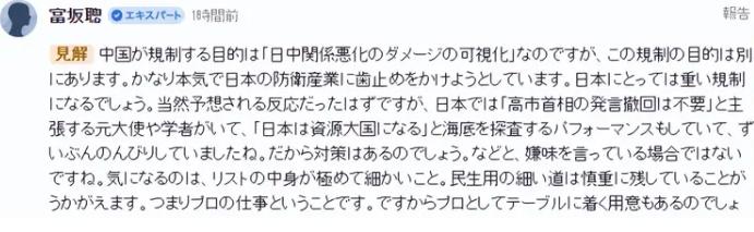 日本教授富坂聪“一眼就看透了”中国的管制措施!2月24日,他发文表示,中国不是在‘报复’,而是在精准‘踩刹车’,日本现在的表现太悠闲了,应该注意到中方给日本留下来‘谈判通道’。 富坂聪不是普通的教授,他任职于日本拓殖大学海外事情研究所,长期研究中日关系和国际局势,在日本学界和舆论圈都有不小的影响力,之前也多次就中日相关话题发表过理性观点。 这次他发文,核心就是吐槽本国政府,发文之后立马在日本引发热议,有人赞同他的观点,觉得政府确实太强硬、太轻敌;也有人反驳他,认为他是在“替中方说话”,但不管怎么说,富坂聪的话,确实点醒了不少糊涂人。 富坂聪在文中特意提到一个关键点,他觉得中方近期的相关举措,根本不是大家猜测的“报复”,而是一次精准的“踩刹车”,这个比喻特别形象,说白了就是给日本的一些激进做法,及时降温。 他直言,中方的举动,本来是理所当然能预料到的反应,可日本政府这边却不当回事,还公然宣称“没必要撤回高市首相的相关发言”,甚至还忙着搞海底资源勘探,一副胸有成竹的悠闲模样。 在富坂聪看来,这种悠闲根本不是自信,而是大意,甚至有点自欺欺人,日本政府一味地强硬到底,表面上看似底气十足,实际上早就被中方的精准举措牵制住,只是自己不愿意承认而已。 更难得的是,富坂聪还注意到一个很细节的地方——中方一直保持着克制,特意留下了民用领域的合作空间,没有把路彻底堵死,这背后的意思很明显,就是给日本留了“台阶”,希望双方能回到谈判桌前。 了解富坂聪的人都知道,他之前就多次呼吁日本政府理性看待中日关系,不要一味地跟着西方站队,更不要刻意挑衅中方,去年年底,他就曾发文提醒,中日合作才是双赢,对抗只会两败俱伤。 反观日本政府近期的表现,确实有些激进,高市早苗上任以来,一直推行强硬的对外政策,在很多问题上刻意迎合西方,甚至频频做出挑衅举动,导致中日关系出现不少波折。 日本政府之所以现在这样子,说白了就是心存侥幸,觉得有西方盟友撑腰,中方不会真的动真格,还以为自己的强硬能换来更多筹码,可他们忘了,中方向来是说到做到,底线不容触碰。 富坂聪的一番话,相当于当众“打脸”本国政府,点破了他们的侥幸心理,他认为,日本政府现在最该做的,不是装悠闲、硬逞强,而是冷静下来,读懂中方的深意,珍惜中方留出来的谈判机会。 很多人都觉得,富坂聪作为一名日本教授,居然能站在客观的角度看待问题,甚至替中方“说话”,确实难得,其实他不是替谁说话,而是看清了当下的局势,知道对抗没有好结果。 中日两国一衣带水,做了几千年的邻居,不管是经贸合作还是民间交流,都有着深厚的基础,这些年,双方在很多领域的合作都取得了不错的成果,给两国人民带来了实实在在的好处。 富坂聪一直主张,中日之间有分歧很正常,关键是要通过对话沟通解决,而不是一味地对抗、挑衅,他之前就曾表示,中国的发展不是威胁,而是机遇,日本应该主动抓住机遇,深化与中方的合作。 可现在日本政府的做法,一味地强硬、挑衅,不仅破坏了中日关系的良好基础,还损害了日本自身的利益,毕竟,中方是日本重要的贸易伙伴,合作才能共赢。 其实不止富坂聪,日本国内还有不少理性的学者和民众,一直主张中日友好,他们都清楚,中日对抗只会两败俱伤,只有和平共处、互利共赢,才能让两国都获得更好的发展。 中方一直以来都秉持着睦邻友好的原则,希望和日本保持良好的合作关系,就算出现分歧,也始终愿意通过对话沟通解决,从来没有想过要把路堵死,这也是中方一直以来的诚意。 希望日本政府能早日看清局势,放下侥幸心理,不要再硬逞强,装聋作哑了,认真倾听像富坂聪这样的理性声音,珍惜中方留出来的机会,早点认错,回到对话合作的正轨,推动中日关系重回正轨。 大家对此有什么看法呢?欢迎各位在评论区留言!