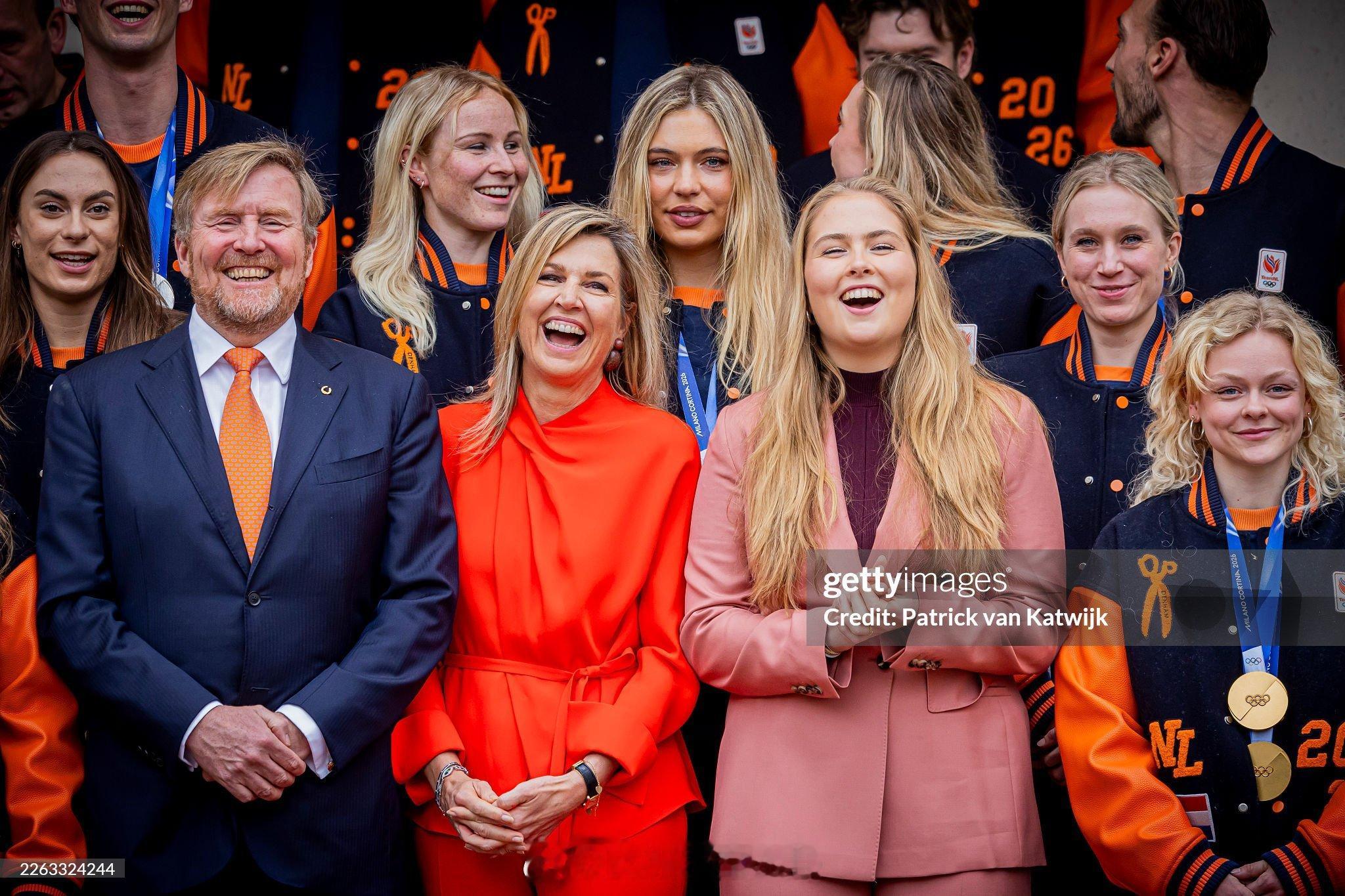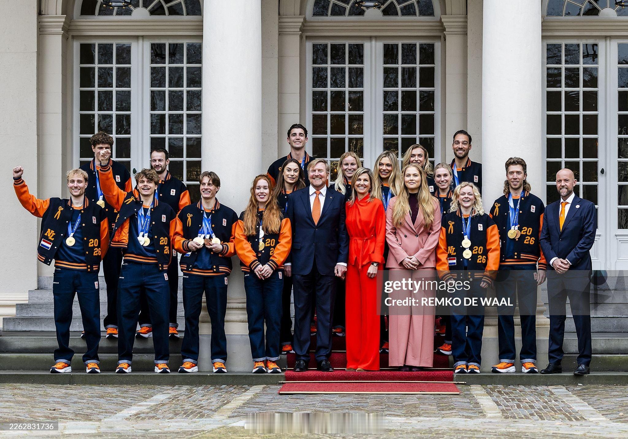2.24 荷兰国王威廉-亚历山大、玛克西玛王后和王储凯瑟琳娜-阿玛利亚公主接待冬奥会运动员,大橙子大道和短道都超强的玛克西玛裤装来自natan,阿玛利亚穿的maxmara