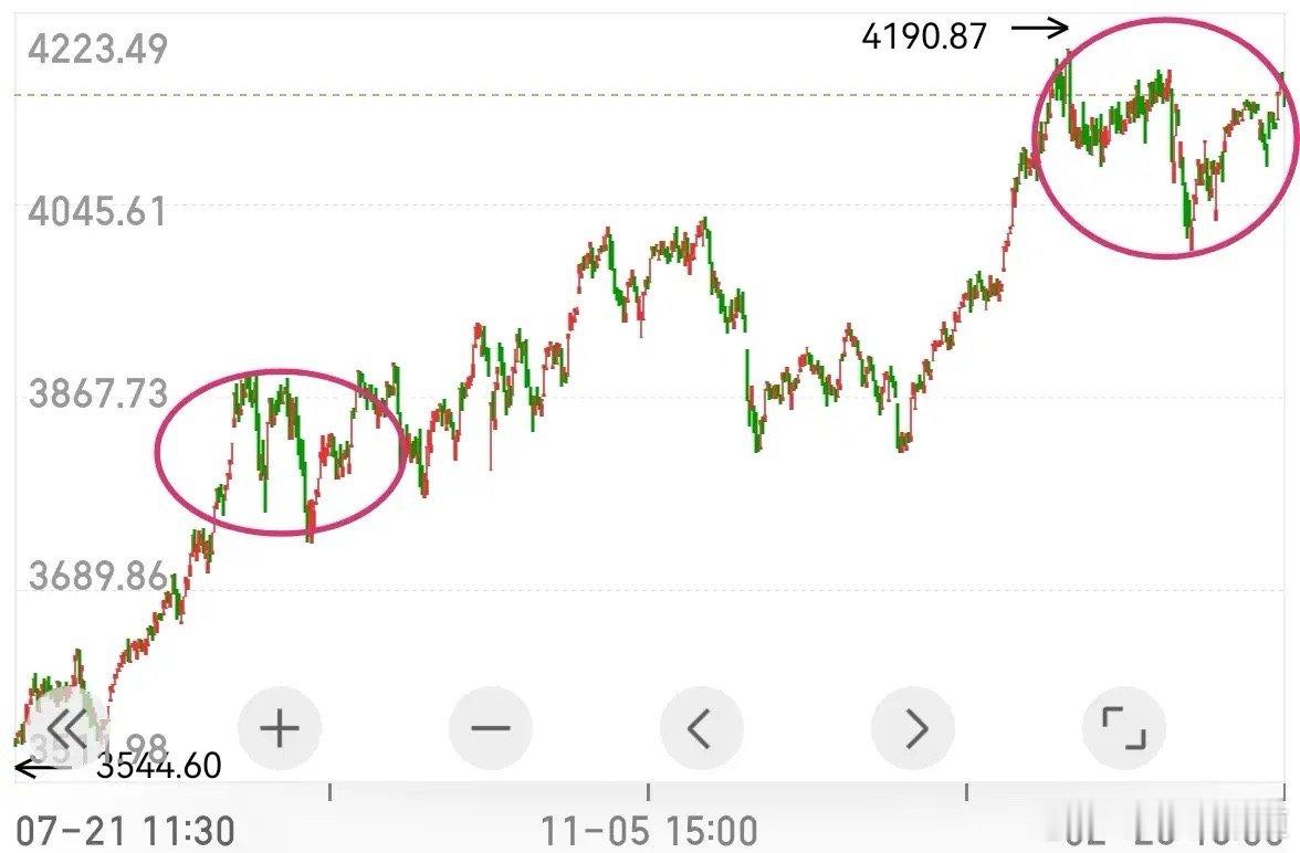 对比一下图中所标注的两个地方的走势,有异曲同工之妙。那么这里整理结束之后,最终还是要继续震荡攀升。可以预见,一旦突破,往上同样可以打出200点左右的空间。