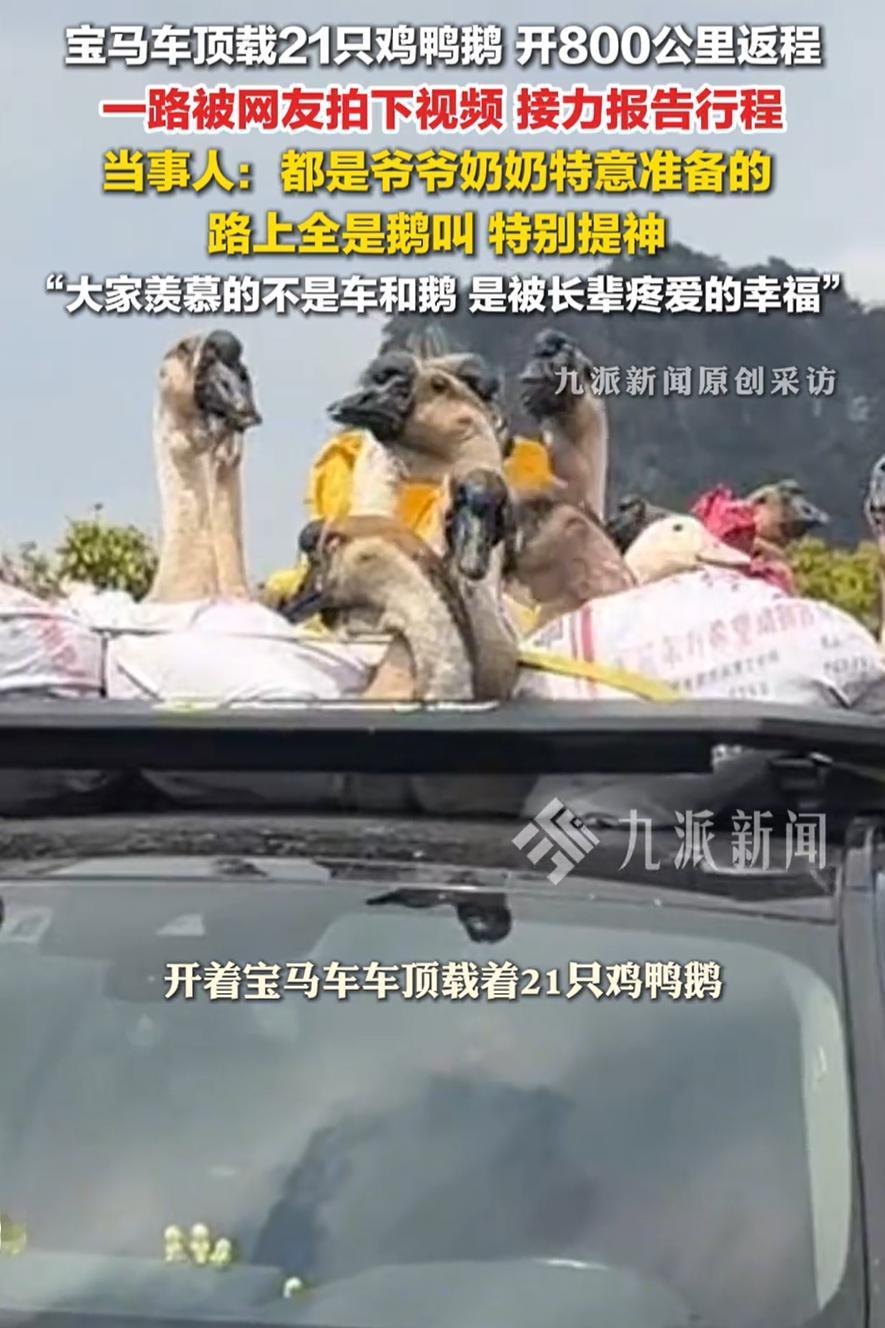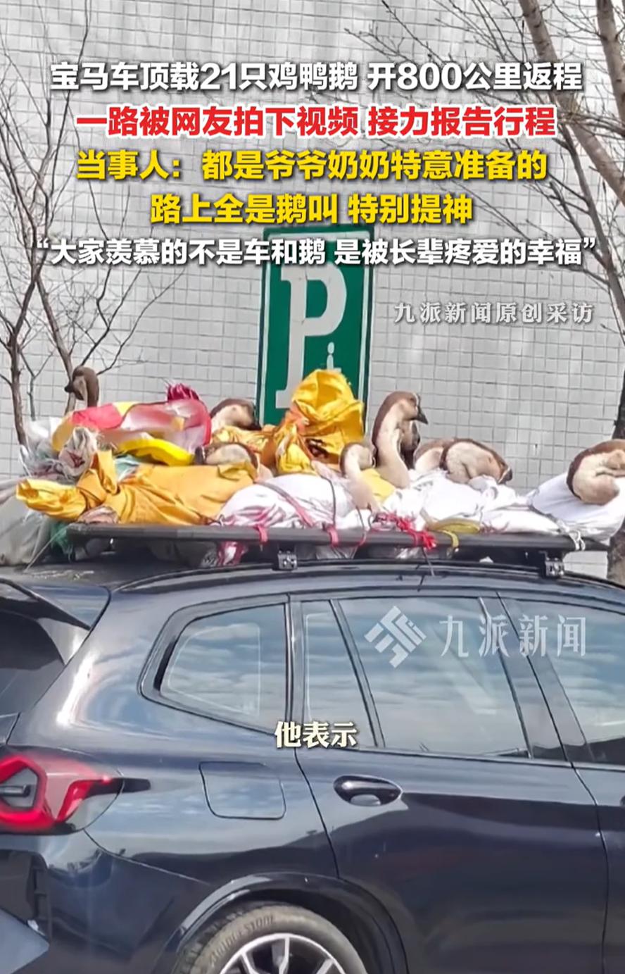 这辆车火了!广西,男子开着宝马车返程,一路上被人拍照,不过并不是他的车有多特别,而是车顶上载着21只鸡鸭鹅,全都是离开前爷爷奶奶给他准备的,甚至路上有人出价购买,但被男子拒绝了 张先生介绍,这次回老家过年,爷爷奶奶给他准备了21只鸡鸭鹅,其中有17只鹅,说什么都要让他带走,可车上也没有地方放,就突发奇想放到车顶,全被绳子绑着脚,老老实实蹲在行李架上 结果这一路,他成了高速上的移动景点。有人追着拍,有人并排看,还有人拿手机发朋友圈说快看那辆宝马,车顶好像在搞养殖。到了目的地,这群鸡鸭鹅一只没少,全部平安抵达 有意思的是,返程的一路头顶都是鹅叫,倒是特别提神 这几年每年春节后,网上都会刷到类似的后备箱大赛。有人带一麻袋红薯,有人带几十斤腊肉,有人带活鸡活鸭,还有人带一口袋土 有人开玩笑说,父母恨不得让你把老家的地皮也刮一层带走。听起来夸张,其实一点不假。对他们来说,你带走得越多,他们在村里的日子就越踏实。那些土货堆满后备箱的时候,他们的心才算是放下了 再说回张先生这21只鸡鸭鹅。路上有人想出钱买,他没卖。换谁也不会卖。那不是鸡鸭鹅,那是爷爷奶奶在村口目送你的时候,眼里那点盼头。是你走了以后,他们跟邻居聊天时的谈资。是我孙子爱吃我养的鹅,今年又带走了十几只。这点念想,比啥都值钱