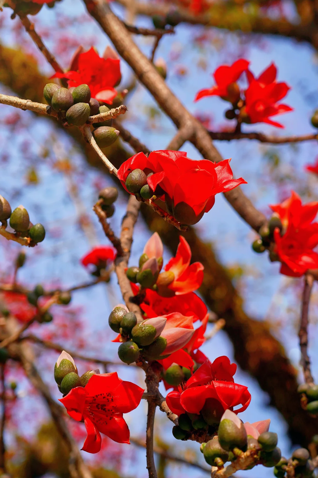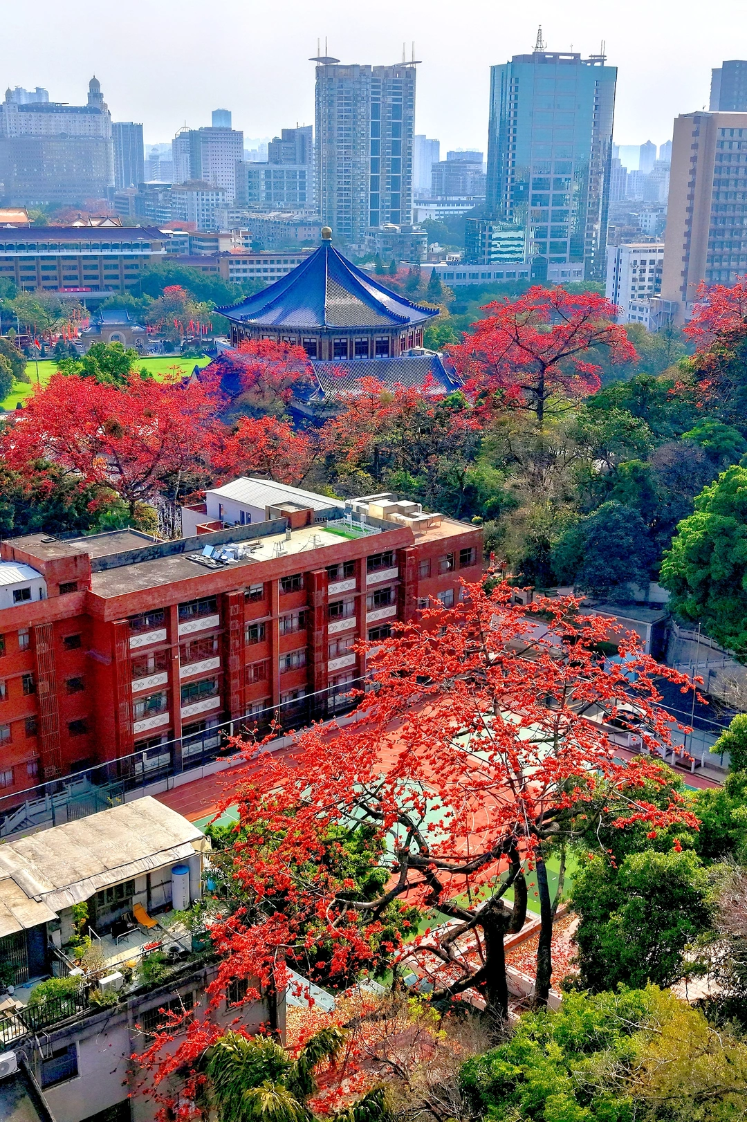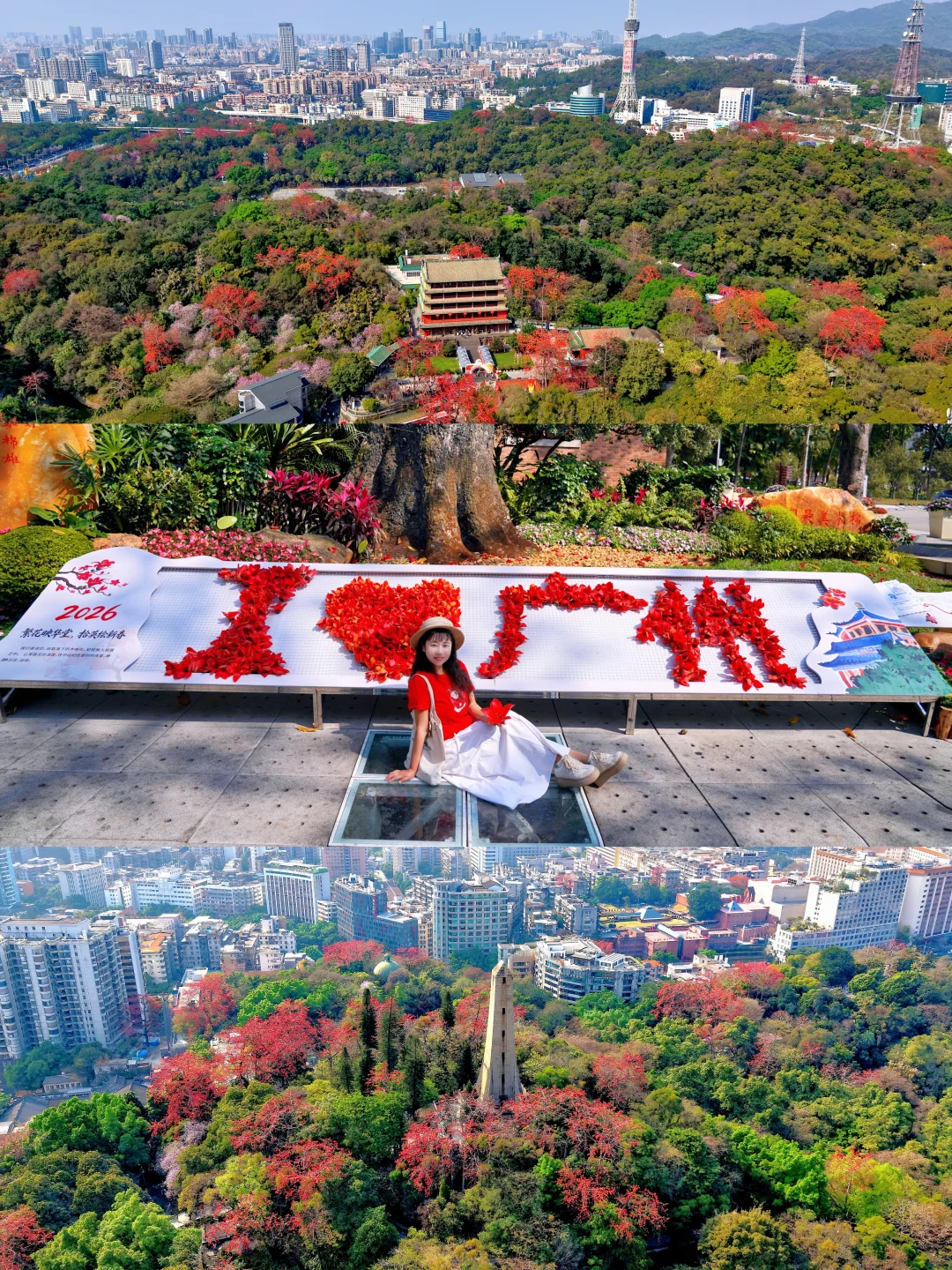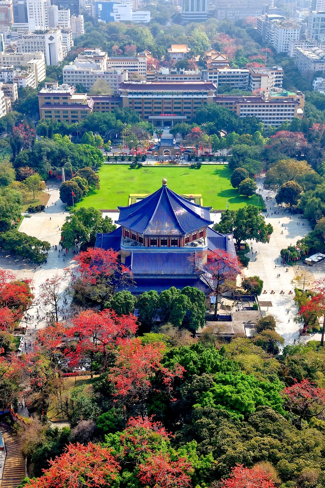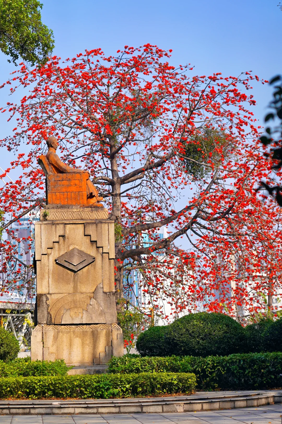 穿过中山纪念堂的门廊,远远望见那棵三百多岁的木棉王。还没走近,就已经被那片红色所震撼——不是张扬的红,是沉沉的、有分量的红,像积攒了三百多个春天的重量。 蓝瓦静静覆在檐上,黄墙默默立在身后。风过时,偶尔有一朵花“啪”地落在青石板上,声音轻,却听得真切。 忽然就明白了,为什么叫英雄花。 - 第1️⃣站:中山纪念堂 苍劲的枝干伸向蓝天,没有一片叶子 只有满树簇拥的炽烈红花 像燃烧的火焰 偶有一朵朵完整的花“啪嗒”落地 那是属于广州人独有的春日仪式感 拾起一朵,仿佛握住了整个春天 背后的纪念堂宝蓝琉璃瓦与金黄墙体 正好衬出木棉的“英雄红” 国风氛围感拉满 - 第2️⃣站:红棉栈道 从纪念堂出来,沿着百步梯爬上纪念碑 沿途是一场春日的视觉盛宴 红红火火的木棉,温柔浪漫的紫荆花 粉白与深红交织,像是春天打翻了的调色盘 爬上纪念碑从高处回望 整座城市都被这抹嫣红点缀得生机勃勃 - 第3️⃣站:广州博物馆 顺着山路走到广州博物馆(镇海楼) 那些沉淀千年的文物 在木棉盛开的季节里 似乎也在诉说着这座“英雄城”的往事 - 📸2.23实拍